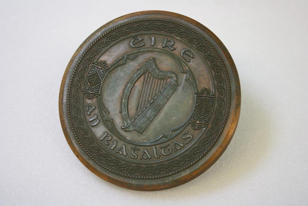 Seal, Irish Free State. Copper counterpart or replica. Harp enclosed by legend 'Éire / An Riaghaltas'. The Government of Ireland. Design in relief.;