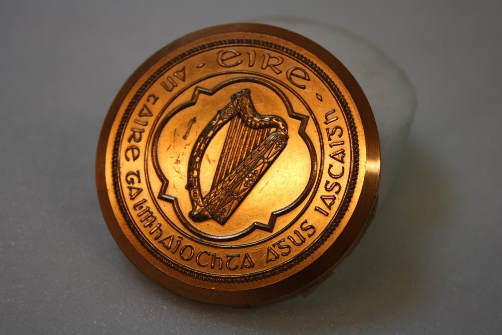 Seal of the Minister for Agriculture and Fishing. Replica, specimen for harp. Harp enclosed by legend 'An tAire Talmhaíochta agus Iascaigh'. The Minister for Agriculture and Fishing. Design in relief.;