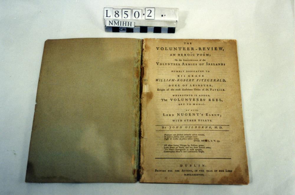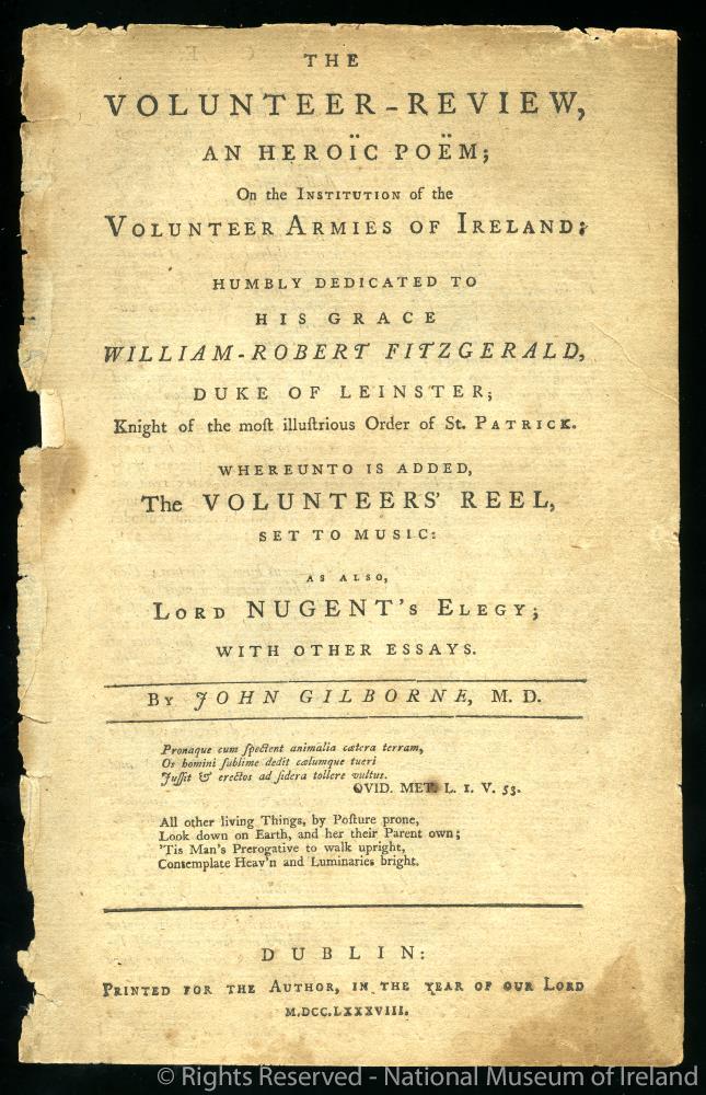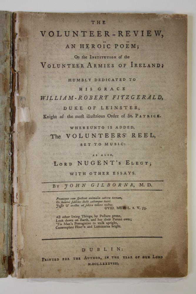 Book, The Volunteer Review, an Heroic Poem on the Institution of Volunteer Armies in Ireland. By John Gilbourne. Printed in Dublin, 1788.;