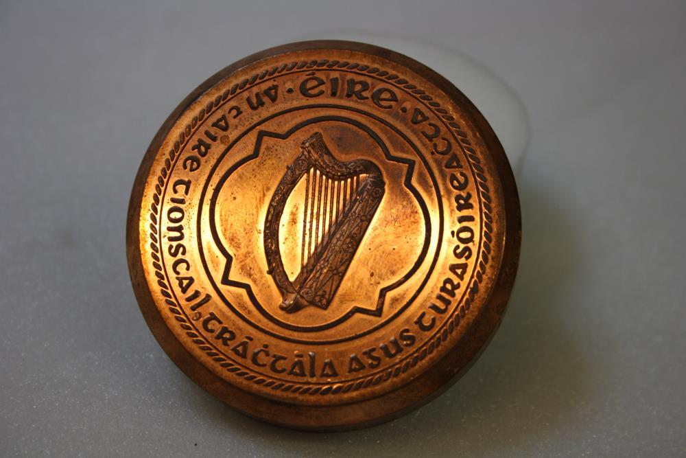 Seal, Irish Free State. Seal replica, copper bronze. Harp enclosed by legend 'Éire / An tAire Tionscail, Tráchtála agus Turasóireachta'. The Minister for Industry, Commerce and Tourism. Design in relief.;