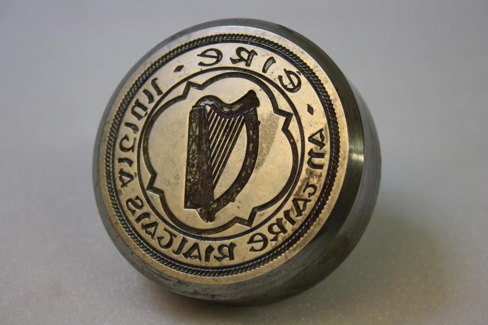 Seal, Irish Free State. Matrix. June 1947 to August 1977. Harp enclosed by legend 'Éire / An tAire Rialtas Áitiúil'. The Minister for Local Government. Design in intaglio.;