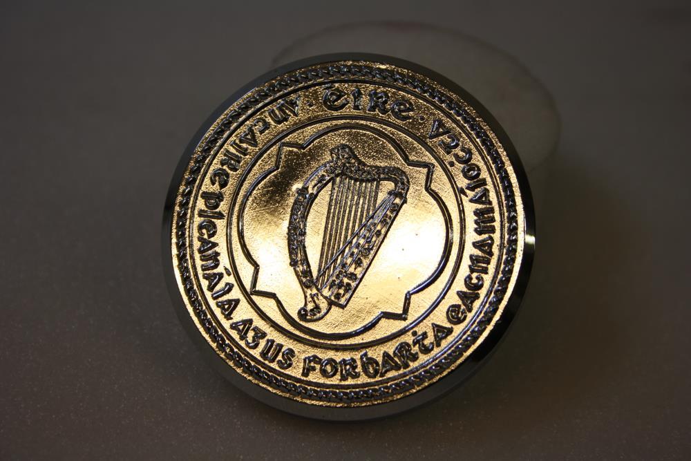 Seal, Irish Free State. Seal replica. Harp enclosed by legend 'Éire / An tAire Pleanála agus Fobhairte Eacnamaíochta Tráchtála agus Turasóireachta'. The Minister for Planning and Economic Development. Design in relief. In box.;