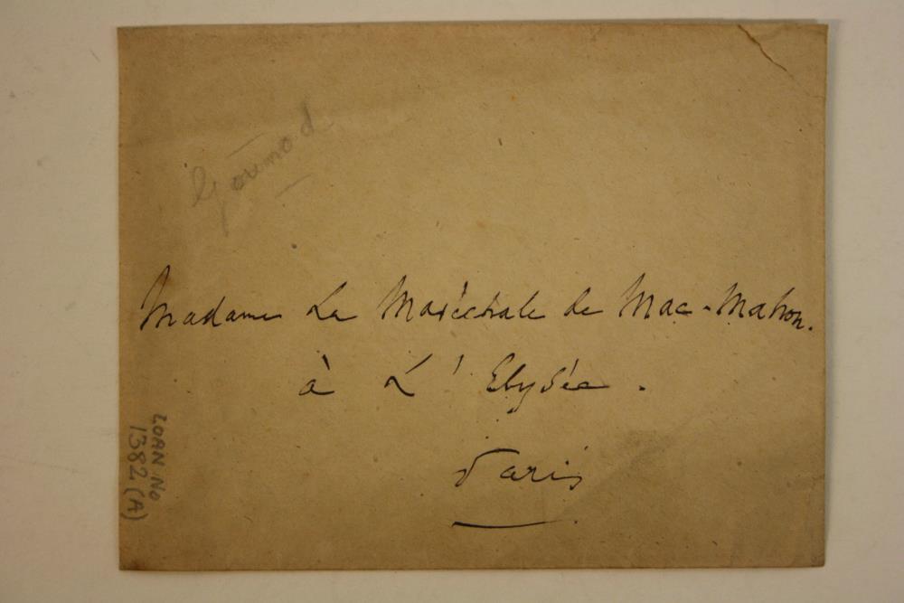 Letter addressed in French to wife of Marshall MacMahon. Autograph signature of Gounod. Envelope.;