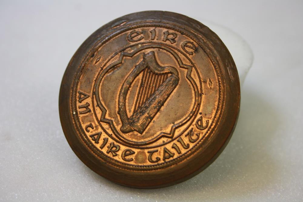 Replica; Seal of the Minister for Lands, Saorstát Eireann. Copper bronze. Ornamental Irish harp within a shaped four point circular shield, around which is inscribed "An tAire Tailte Minister for Lands'. Design in relief.;