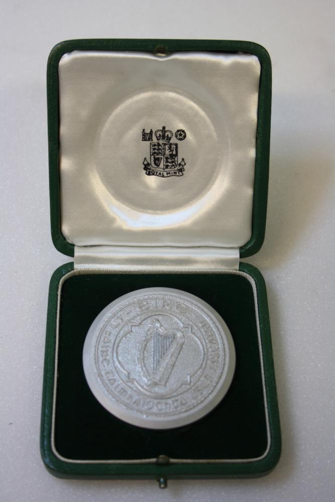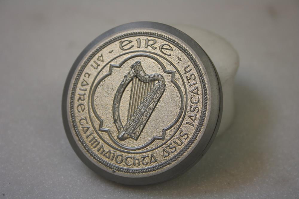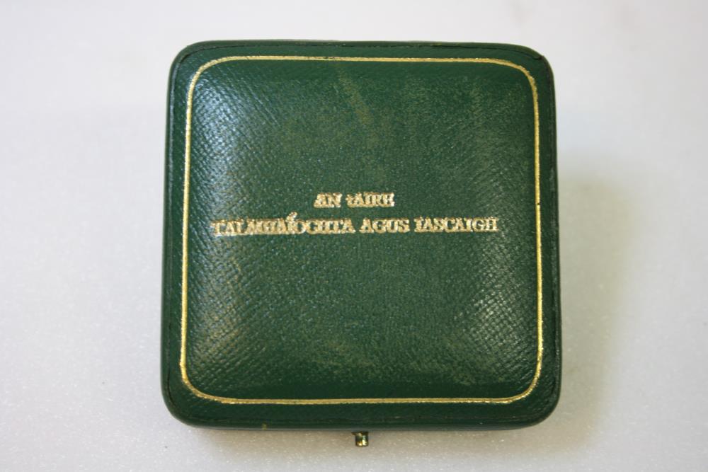 Seal; circular, with silver-coloured with harp in the centre surrounded by a four-pointed circular outline and bearing the inscription - "EIRE, an tAire Talmhaiocht agus Iascaigh". Department of Land and Fishing. In green box, marked 'Royal Mint.;