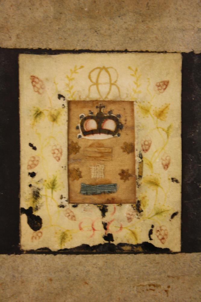 Document mounted on a card, with relics attached to reverse, stating that one is a fragment from the last garter of the King, one is a piece of the waistcoat he died in, and some of his hair. Also, instructions that the owner is never to part with it. Two seals - one at top with two lions rampant on either side of a crest crowned and the legend "Fortis Sub Forte Fatiscet". Second one at bottom of document with a dragon surmounted by a lion and crowned. Signed "V.J.B.". Circa 17th / 18th century.;