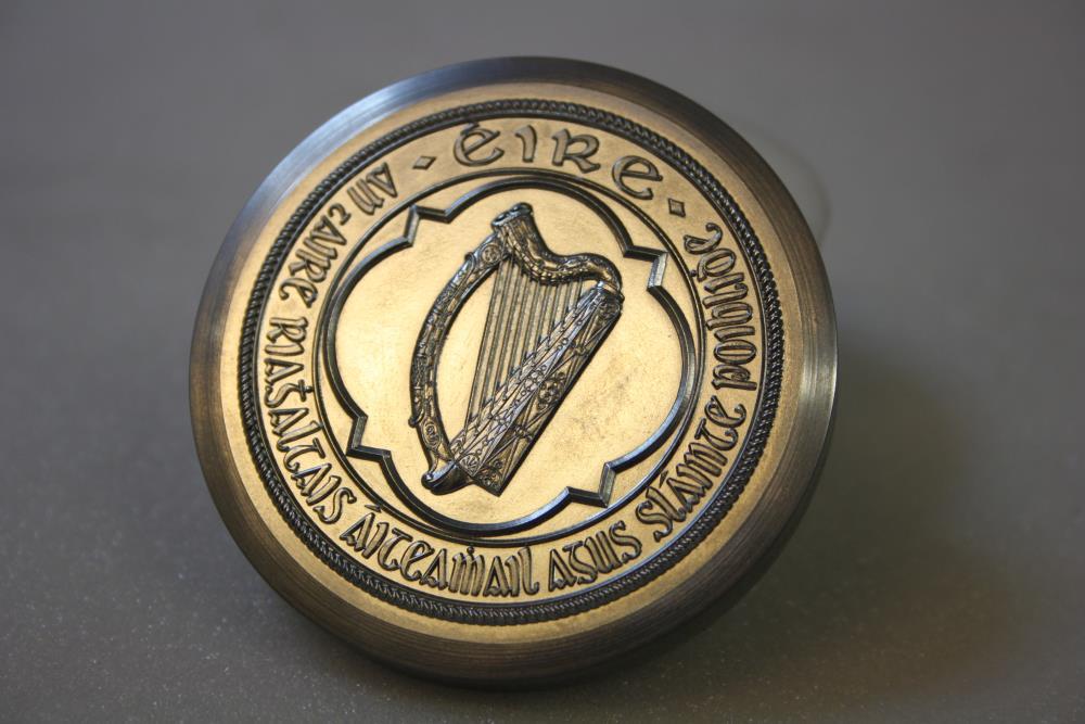 Seal, Irish Free State. Seal replica. 1923 to 1947. Harp enclosed by legend 'Éire / An tAire Riaghaltas, Áiteamhail agus Sláinte Poiblidhe'. The Minister for Local Government and Public Health. Design in relief. In box.;