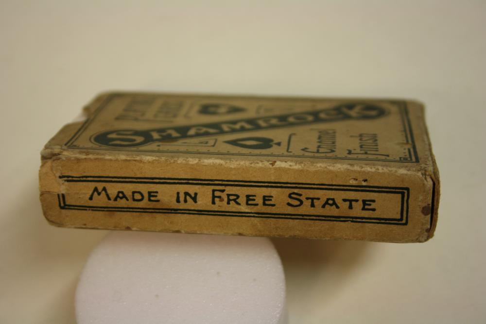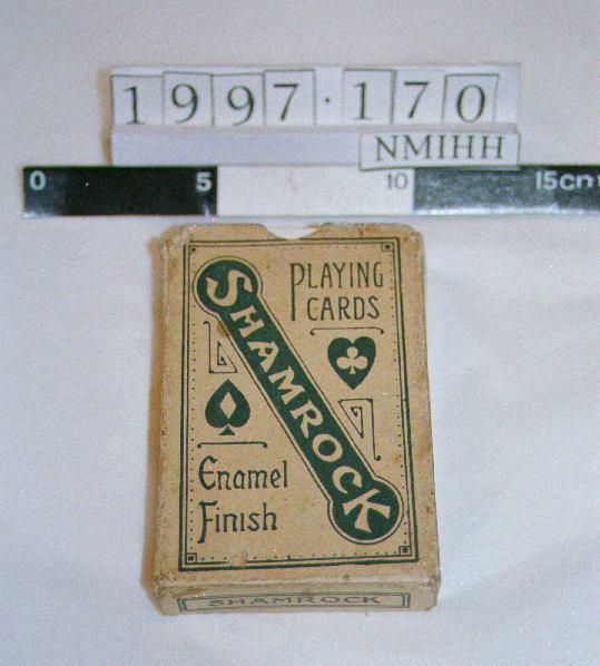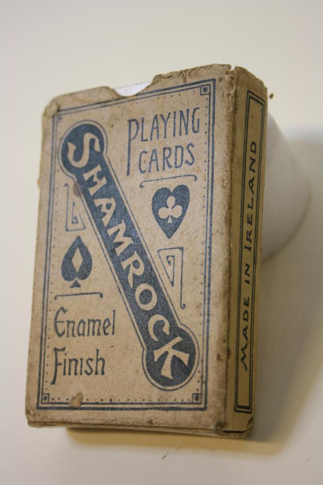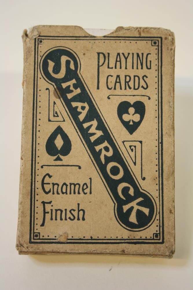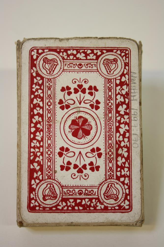 Shamrock enamel finish deck of playing cards. Made in the Irish Free State. Back in red, depicting shamrocks and four harps. Complete deck.;
