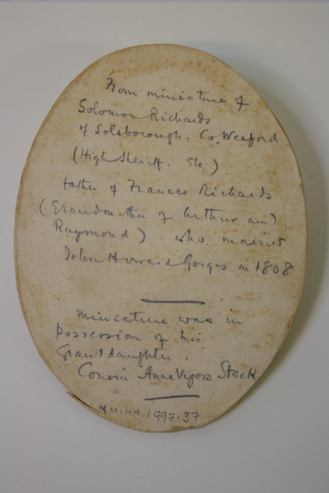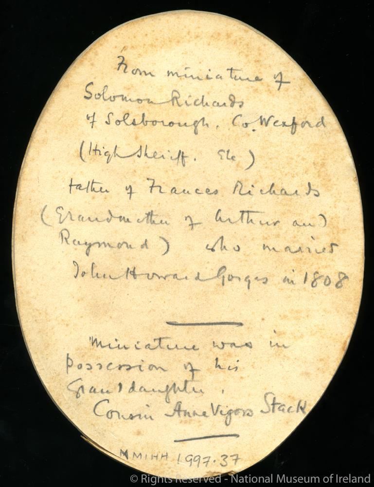 From miniature of Solomon Richards of Salsborough, Co. Wexford (High Sheriff, etc.), father of Francis Richards (Grandmother of Arthur and Raymond) who married John Howard Gorges in 1808. Miniature was in possession of his granddaughter, Cousin Anne Vigors Stack.;