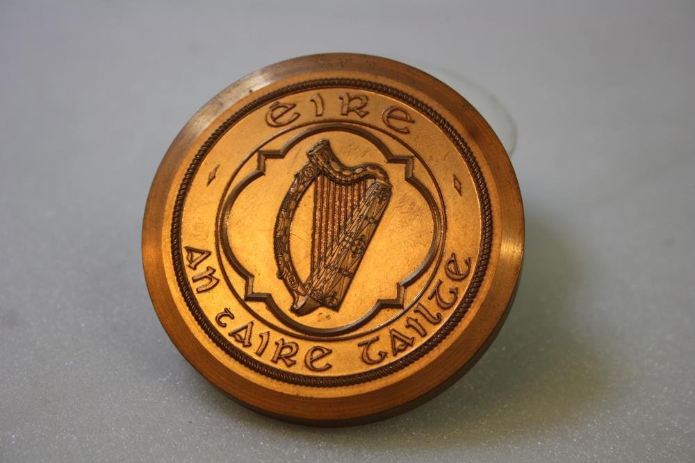 Replica; Seal of the Minister for Lands, Saorstát Eireann. Copper bronze. Ornamental Irish harp within a shaped four point circular shield, around which is inscribed "An tAire Tailte Minister for Lands'. Design in relief.;
