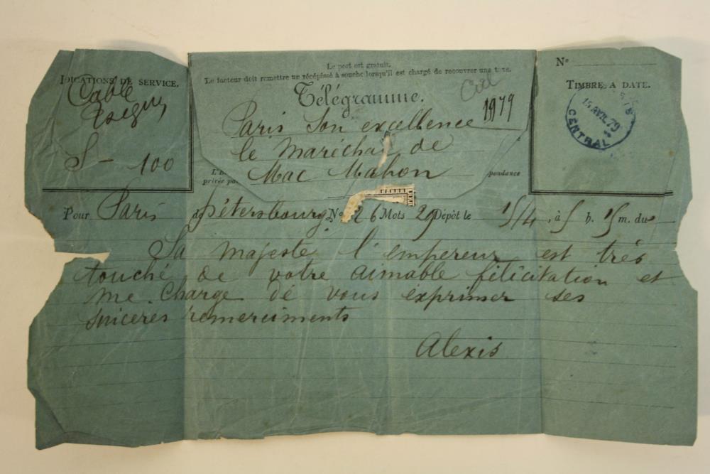 Telegram addressed in French to Marshall McMahon signed Alexis, from St. Petersburg, 1879.;