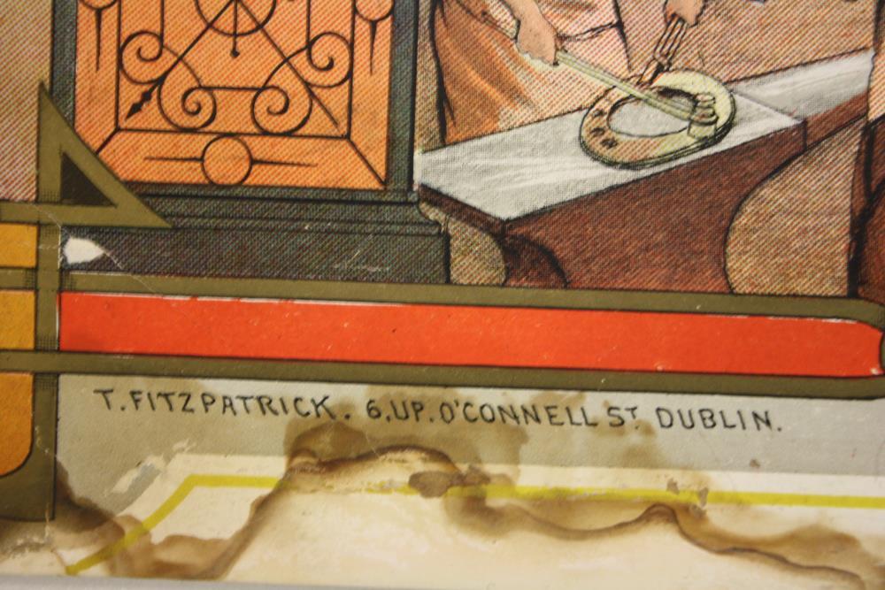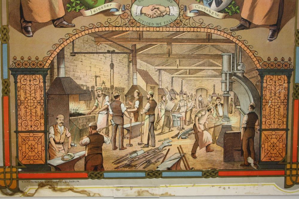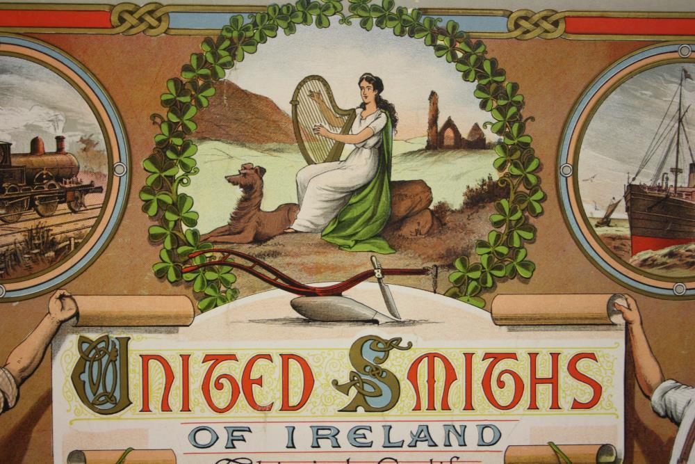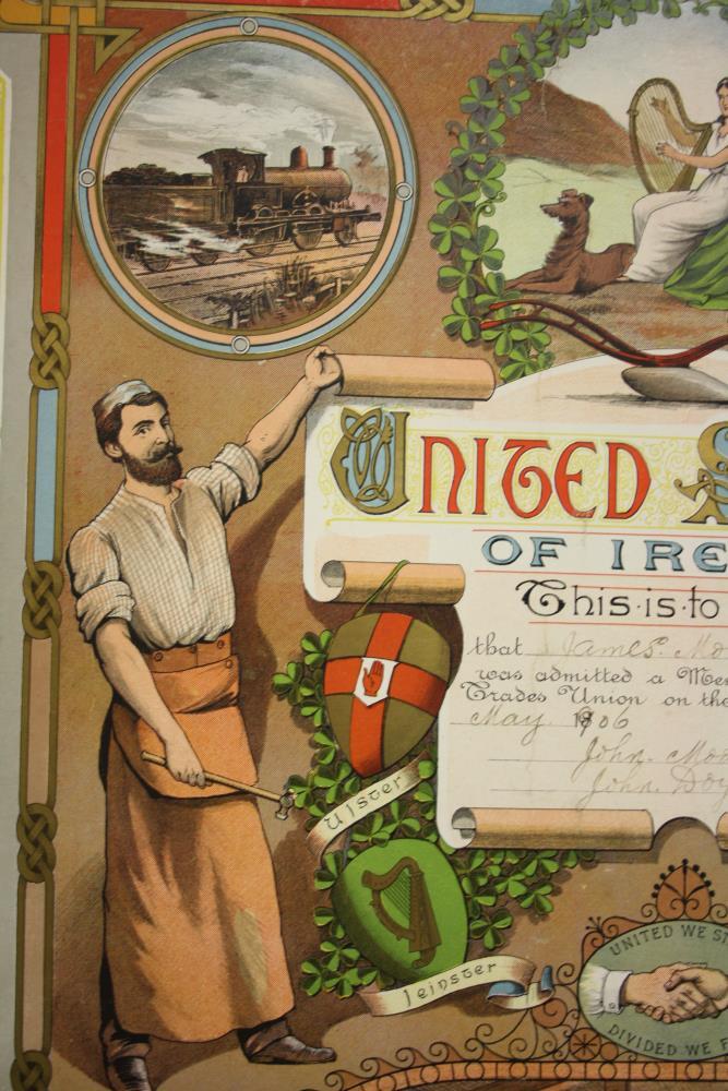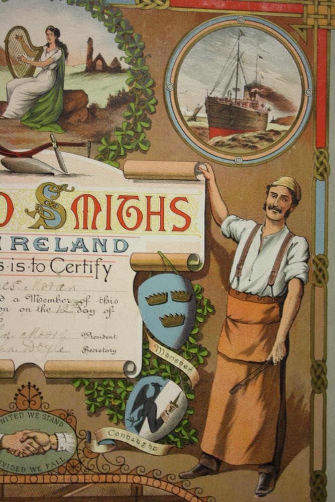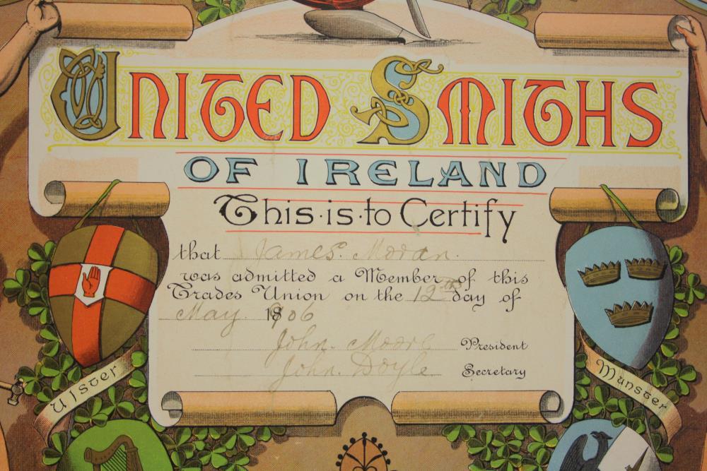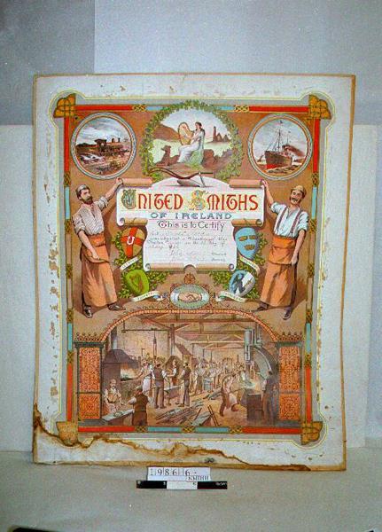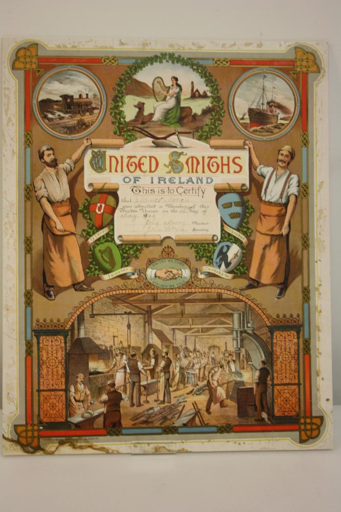 United Smiths of Ireland Membership Certificate 1906. 54 by 66 cm. paper mounted on board, illuminated by T. FitzPatrick, 6 Upper O'Connell St., Dublin. Showing a steam engine and a ship in vingnettes on either side of a Hibernia figure, with harp and hound, and round tower in background, above and a general view of a Smithy below. The text records the admission of James Moran to the Trade Union of 12 May 1906. (HH:1983.11);