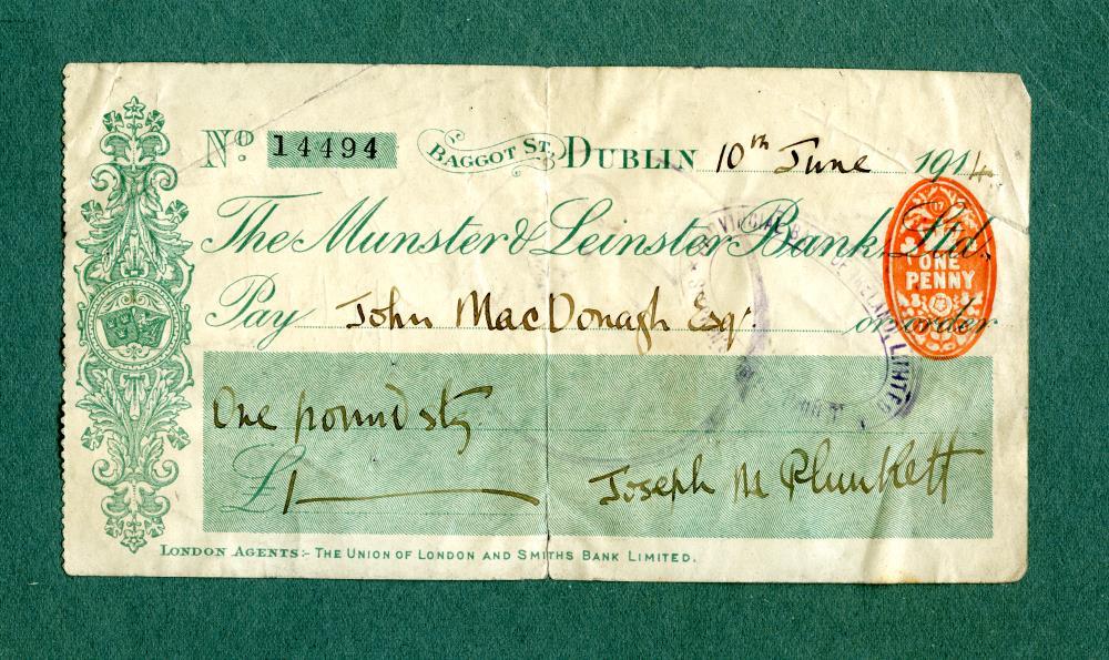 Cheque drawn on the name of John MacDonagh for £1 on June 10, 1914, signed by Joseph M. Plunkett. Endorsed by John Mac Donagh and Thomas Mac Donagh. Munster and Leinster Bank, Baggot St., Dublin. Received by J. Breen from the solicitor who had charge of Plunkett's papers.;