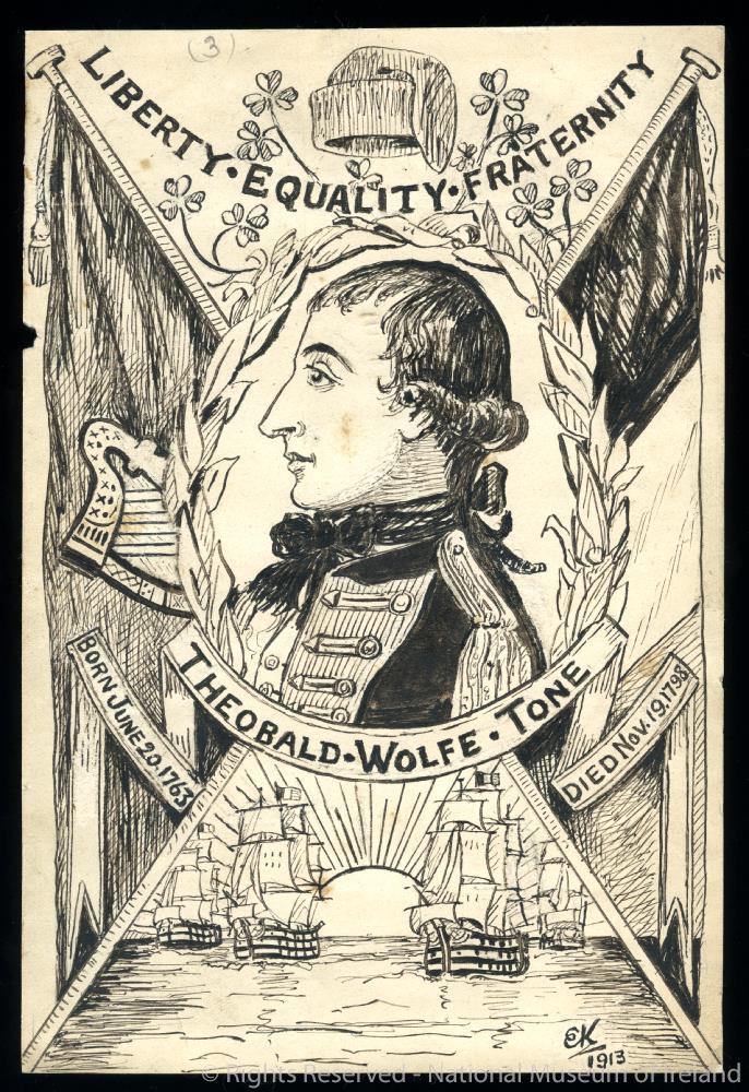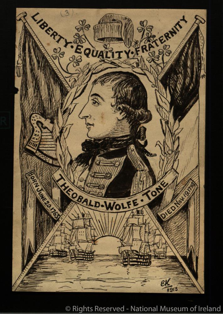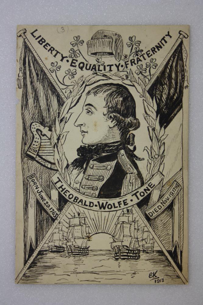 Postcard drawn by Ernest Cavanagh of 'The Workers' Republic'. Depicting Theobald Wolfe Tone. Such postcards were sold for the purpose of raising funds for the Wolfe Tone Monument.;