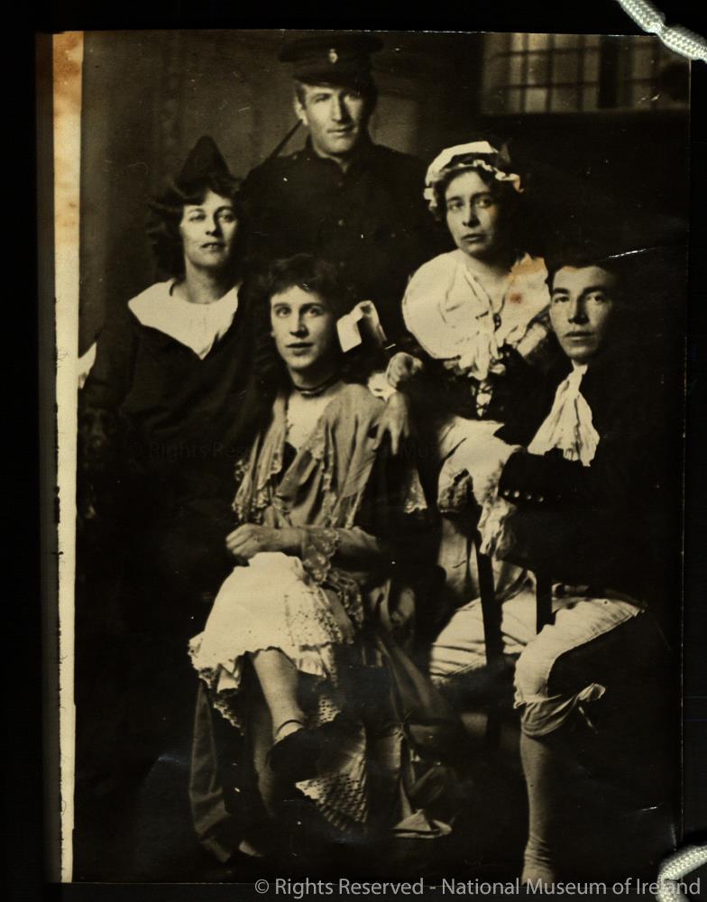 Countess Markievicz, photograph of. Photographic print - Group of five persons including Countess Markievicz in amateur theatricals. The Group: left to right:- (1) The Countess in dress of leprechaun; (2) Mr. Konrad Peterson, a Science student, dressed as a woman; (3) Miss Helena Moloney, in mob cap; (4) Mr. Michael O'Gorman, in 18th century costume; (5) standing at back, Mr.George Doran, in R.I.C. uniform. 8.5 inches by 6 inches.;