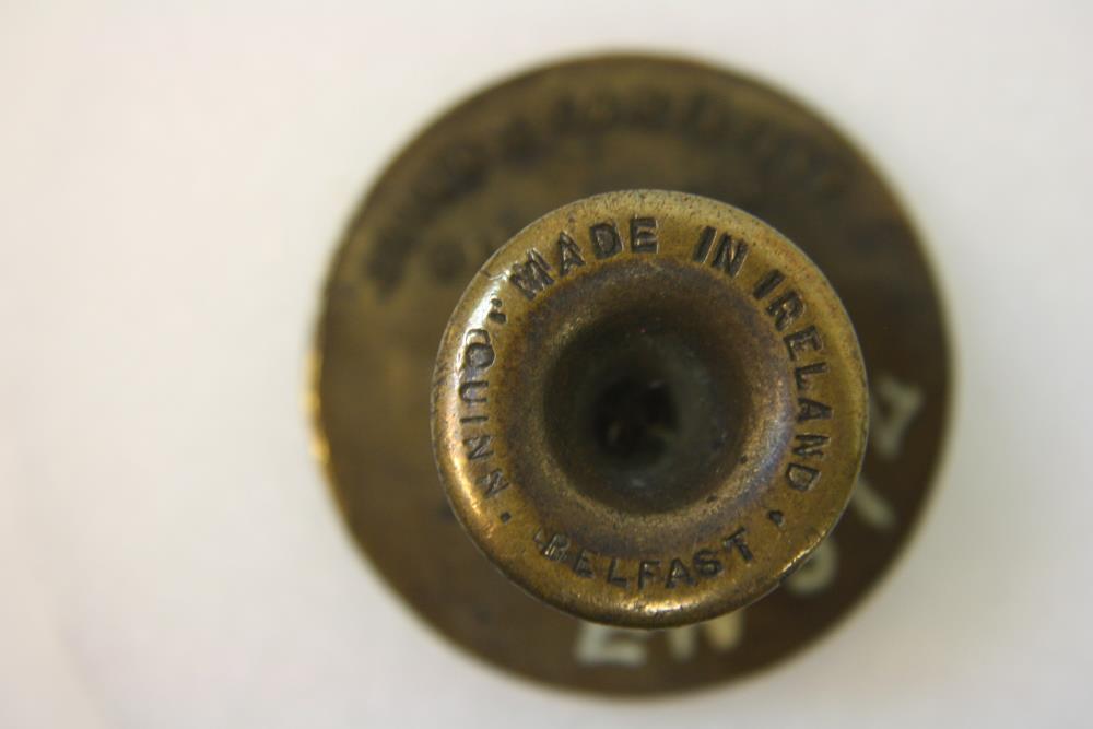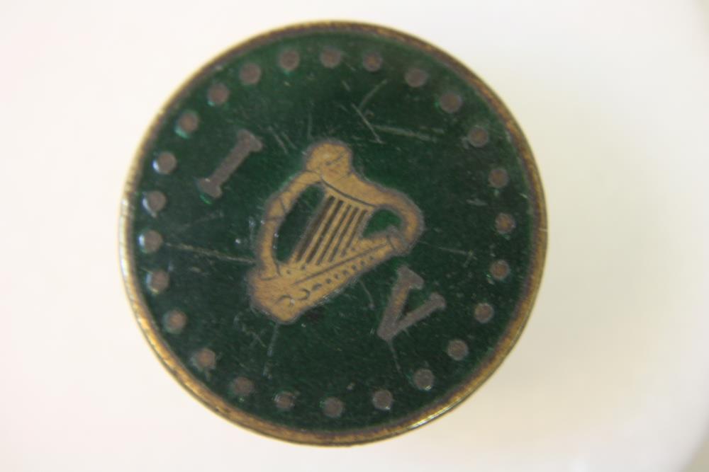 An early badge of the Irish Volunteers showing a harp on green enamel background with the letters "I & V" to left and right. Marked: "Made in Ireland, Quinn & Co. Belfast". The badge was used previous to 1916.;