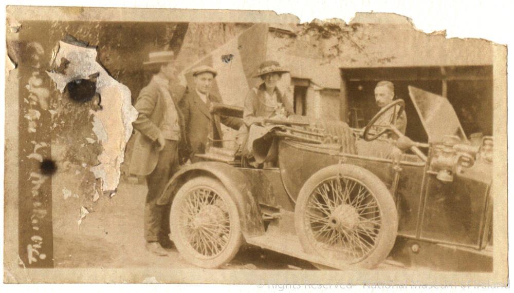 Photograph autographed by Countess Markievicz. Left to right: P. Sweeney, Loughrea, Peter de Loughry, Kilkenny, The Countess (in car) and another man (No. 3).;