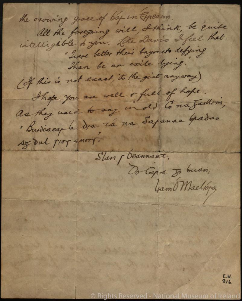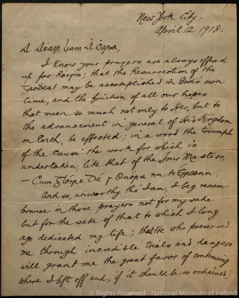 A holograph letter from Liam Mellows to An t-Athair Liam Ó Domhnaill, from Duquesne University, New York City, April 12, 1918.;