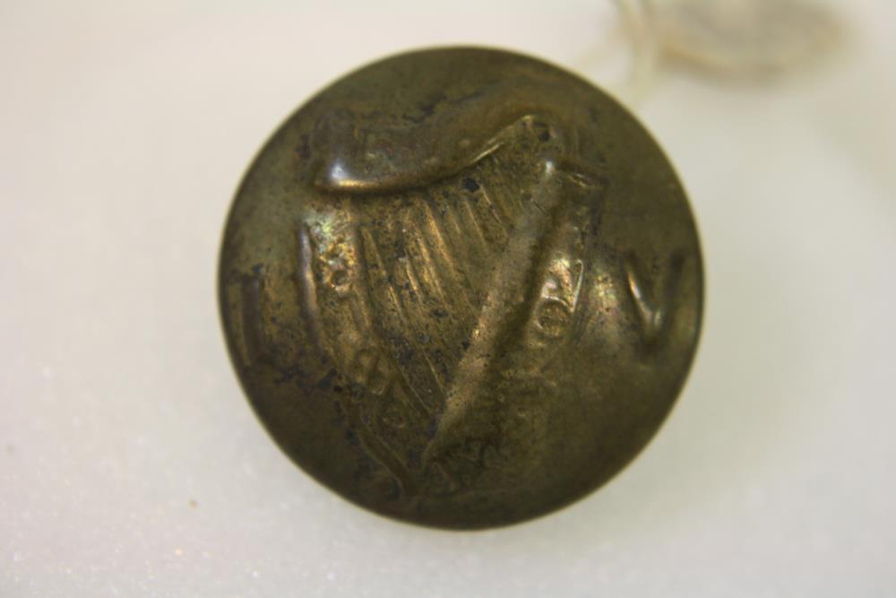 Irish Volunteers tunic button, brass. Harp and I.V.;
