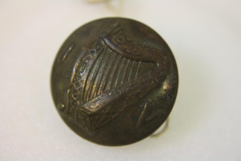 Irish Volunteers tunic button, brass. Harp and I.V. On back - (sketch).;
