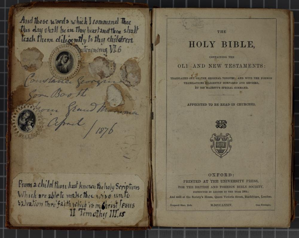 Countess Markievicz's bible. Printed Oxford University Press, 1874, received by Countess Markievicz, April 1876, when she was eight years old, from her grand-mother, Lady Fanny Hill, the mother of Lady Georgina Gore Booth, the Countess' mother. In 1876 Sir Robert, the Countess' father died. The Countess had the Bible for 51 years. In it are dried roses taken from her bed after her last illness and a picture of her grave taken by Stanislas Markievicz. Inscribed on inside of cover: "Constance Georgina Gore Booth, from Grandmamma. April, 1876".;