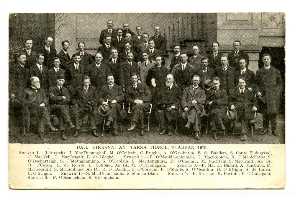 Postcard photograph of the Second Meeting of Dáil Eireann, 10 April 1919. Group photograph of the Deputies, with names underneath.;