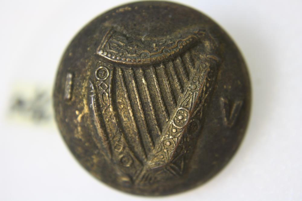 Irish Volunteer button, brass. A harp between the letters I.V. On back: SPECIAL QUALITY. Diam., circa 9/10".;