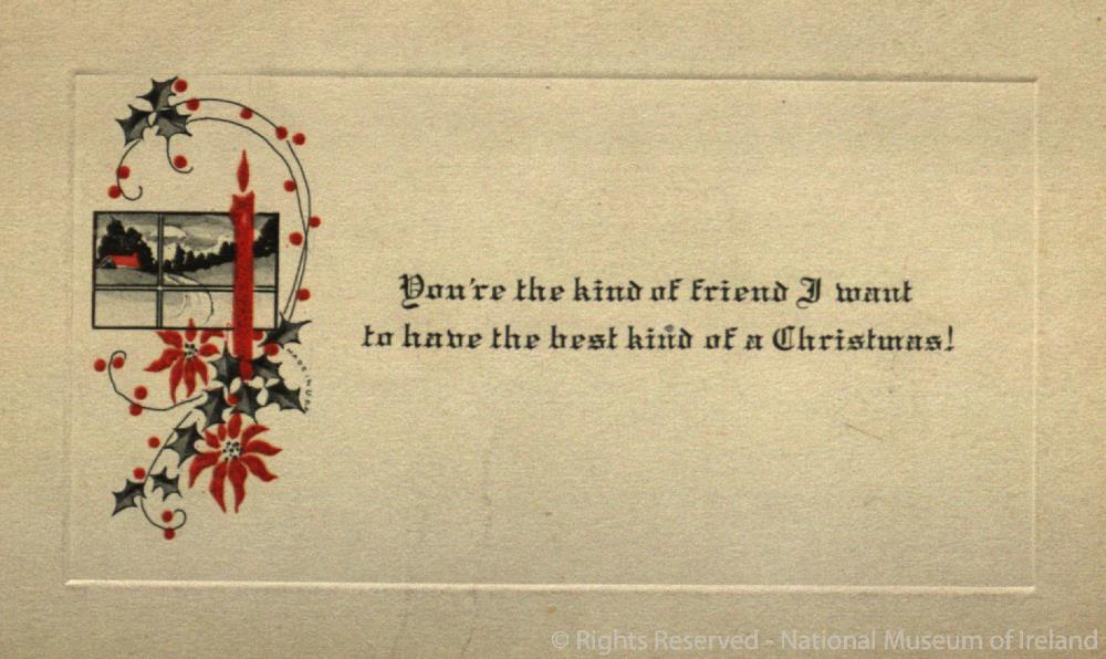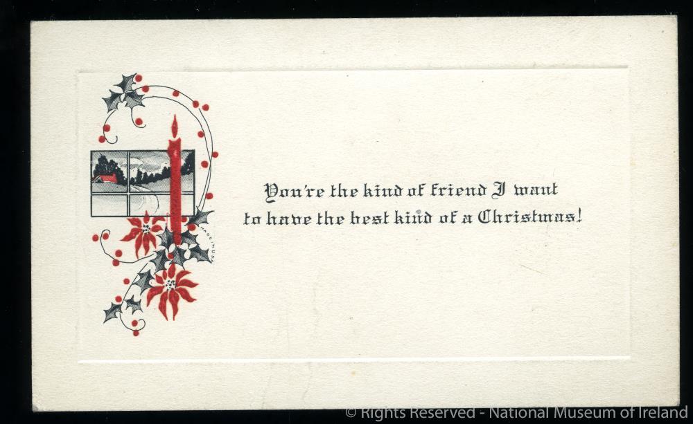 Christmas card from P. O'Doherty , 305 Harrison Avenue, Harrison, New Jersey, U.S.A. to William O'Brien, about 1917. With 'You're the kind of friend I want to have the best kind of a Christmas'.;