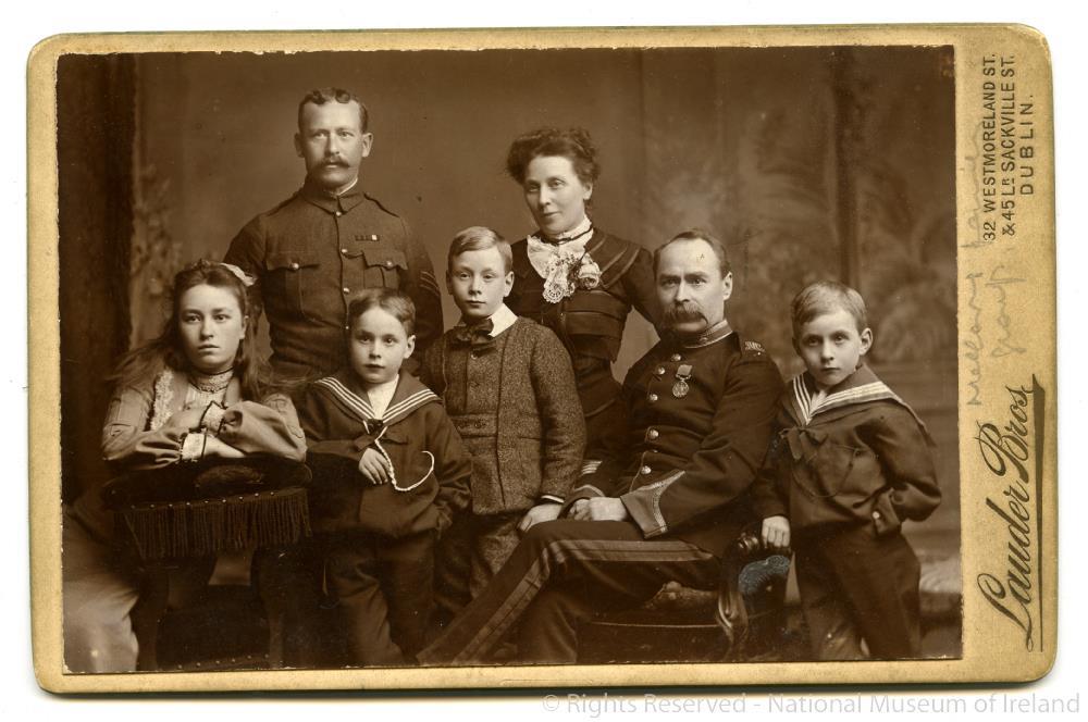 Studio photograph of the Mellows family showing a cousin in British uniform with Mrs. Sarah Mellows at back. From left in front Jennie, Freddie, Liam, Mr. William Joseph Mellows and Barney. Taken pre 1906. Photograph by the Lauder Brothers, Dublin.;