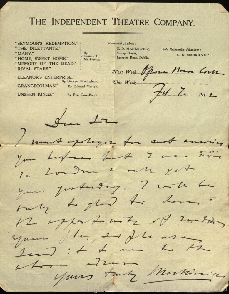 Letter from Count Markievicz, 1912, to Michael Waldron. On Independent Theatre Company notepaper.;