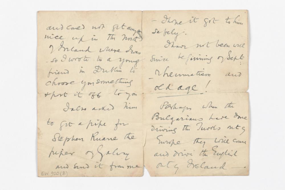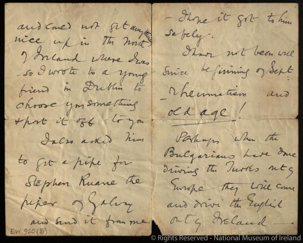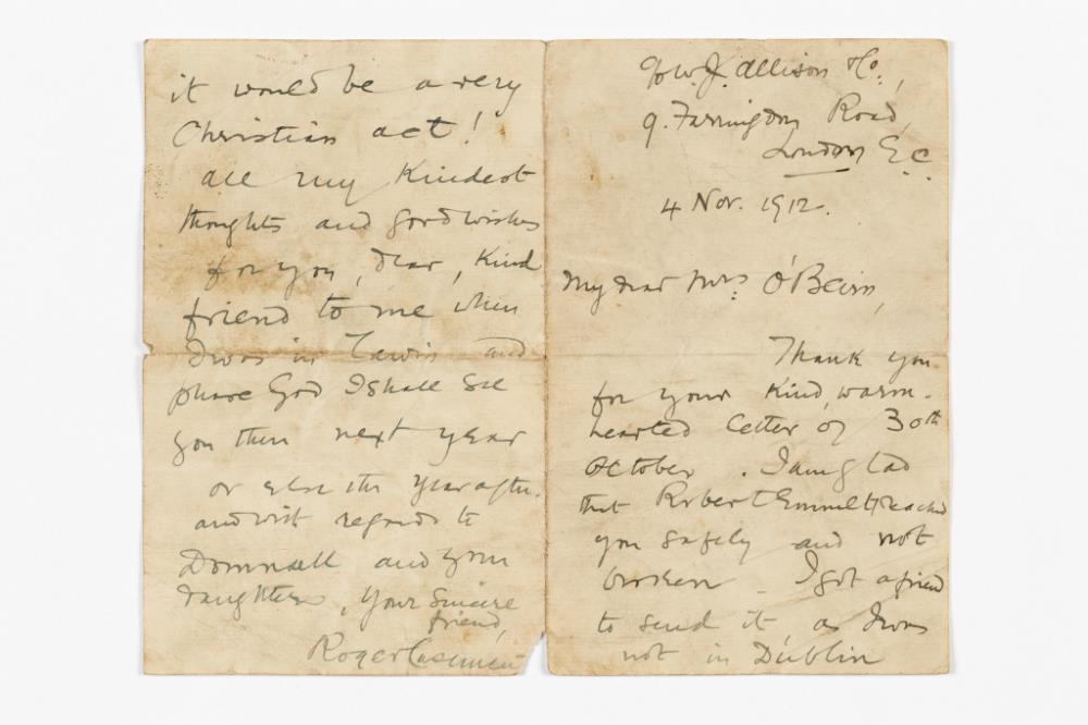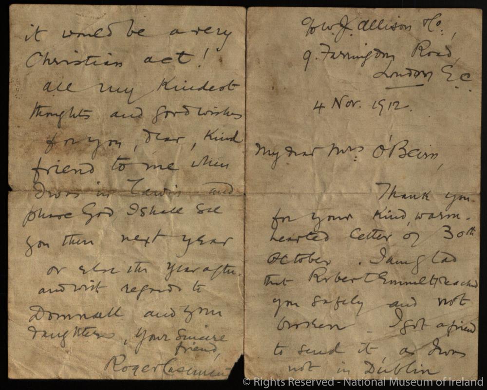 Letter, handwritten by Sir Roger Casement to Mrs. O'Beirn, grandmother of the donor. Addressed from 9 Farrington Road, London, 4 November, 1912. Re presents sent to her and to Stephen Ruane, the Galway piper; reference to driving English out of Ireland. No envelope. 4 pp.;
