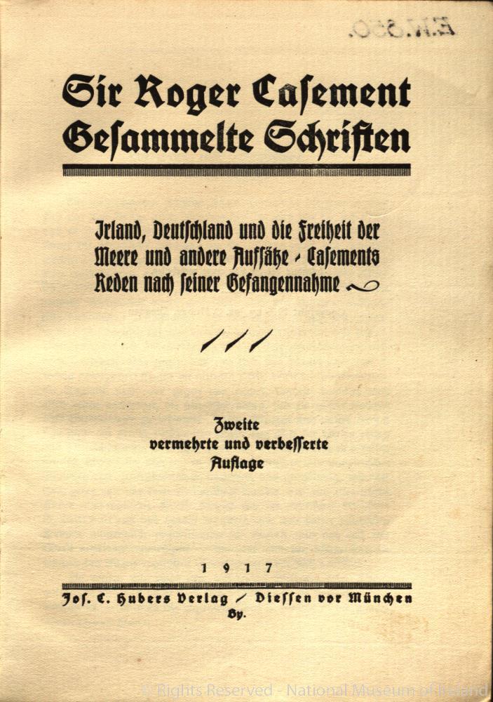 Copy of a book by Sir Roger Casement. "Irland, Deutschland und die Freiheit der Meere und Andere Aufsatze" - Casement's writings translated to German - zweite Auflage, 1917, Jos. C. Huber, Diessen vor Munchen.;