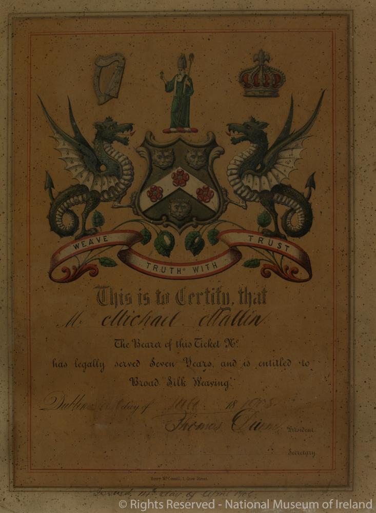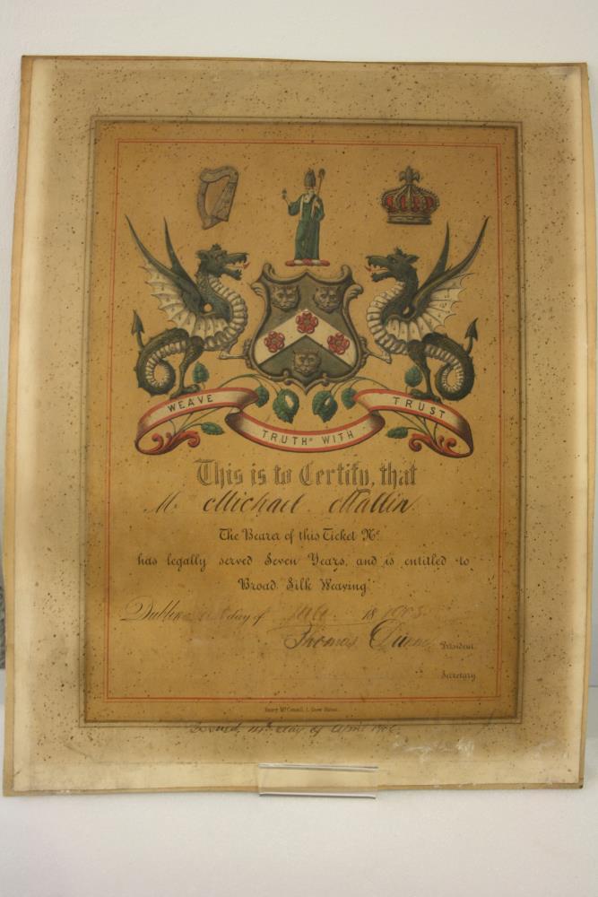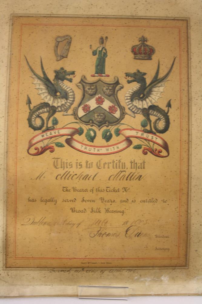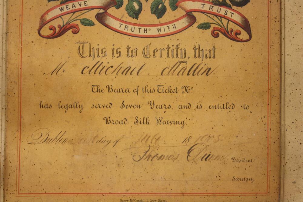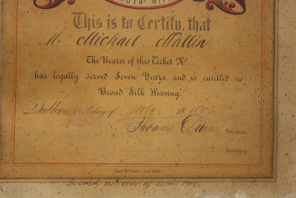 Michael Mallin. 16.5 x 12.5 inches certificate of his entitlement to weave, issued 14 April 1906 and signed by Thomas Quinn as President.;