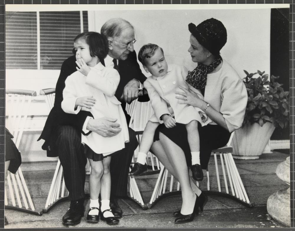 Black and white photograph of Eamon de Valera with Princess Grace Kelly and two of her children c. 1961.;