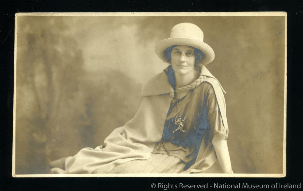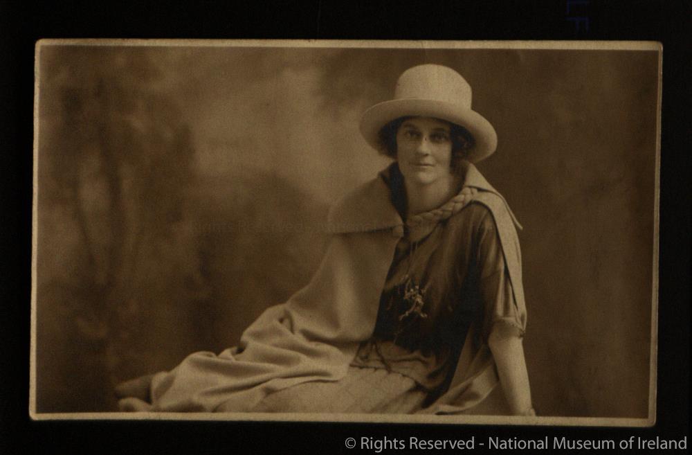 Photograph of Countess Markievicz shown reclining, supported by her left hand, wearing a hat and cloak. 5.2 inches by 3.1 inches.;