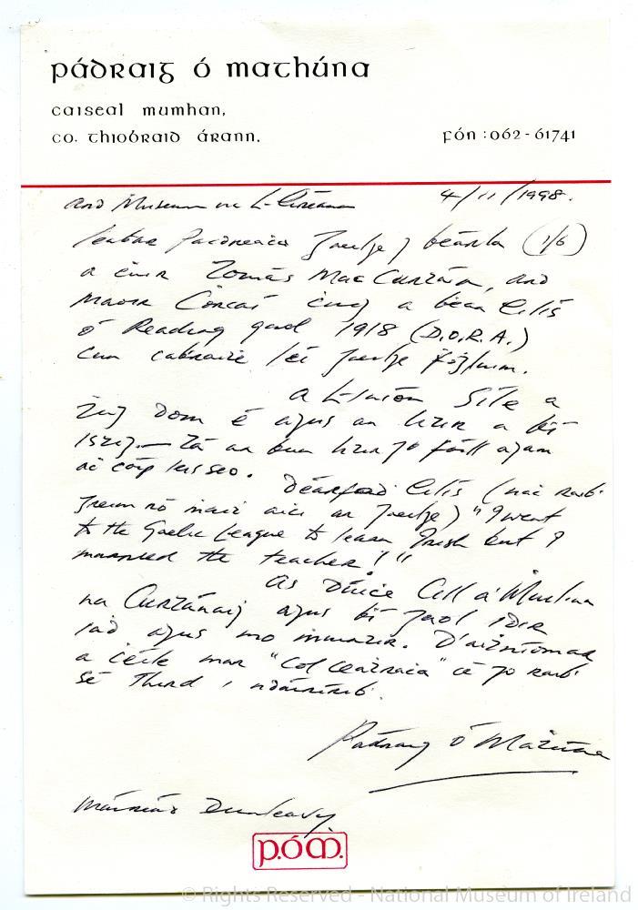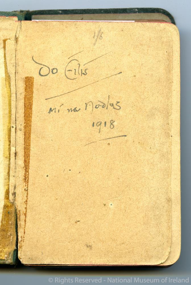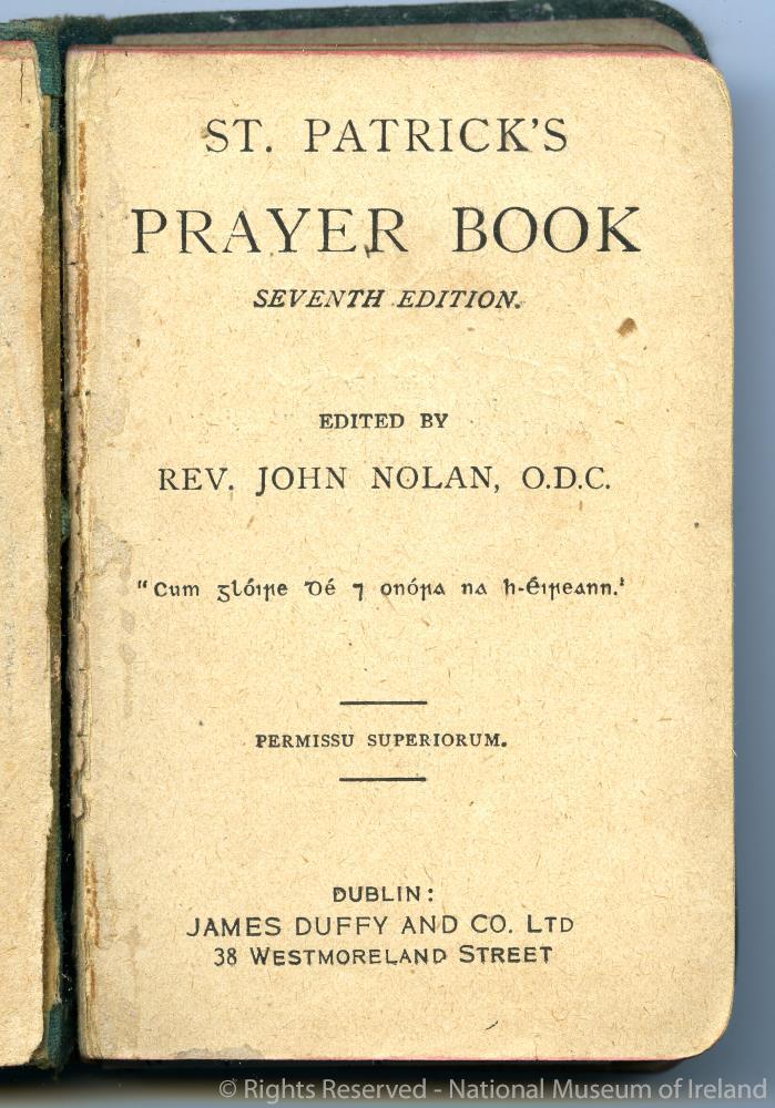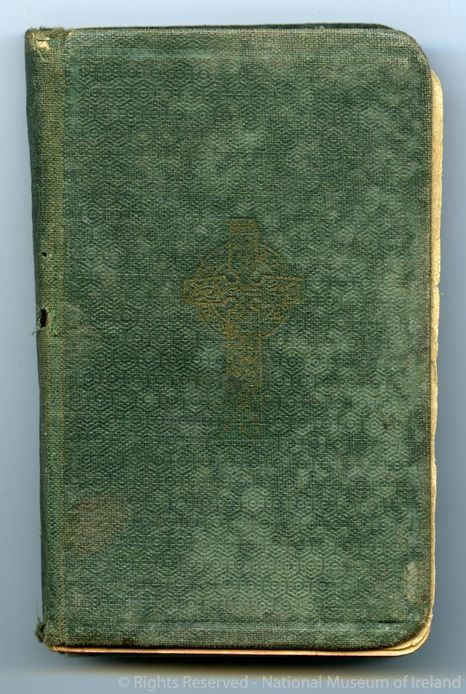 Prayer Book Dublin, 1918. Prayer book, in Irish and English on alternating pages. Given by Tomas Mac Curtain, Lord Mayor of Cork, to his wife Eilis in 1918, while a prisoner in Reading Jail. Green leather (?) cover; dedication on inside first page: 'Do Eilis/ Mi na Nodhlag/ 1918'. Nolan, John (Rev.) ed., St. Patrick's Prayer Book (Dublin:James Duffy and Co. Ltd., 1918). 135pp. Length 12.2 cm x Width 8.1 cm x D 1.5 cm. Also: photocopy of a note that accompanied the gift. Text: 'To my darling wife -- with all good wishes for her health and happiness and with the fervent hope that we may soon again be united -- Your devoted -- Tom "It is not the value of the gift which counts but the undying love of the giver"'. Also: accompanying letter from donor giving details of above.;
