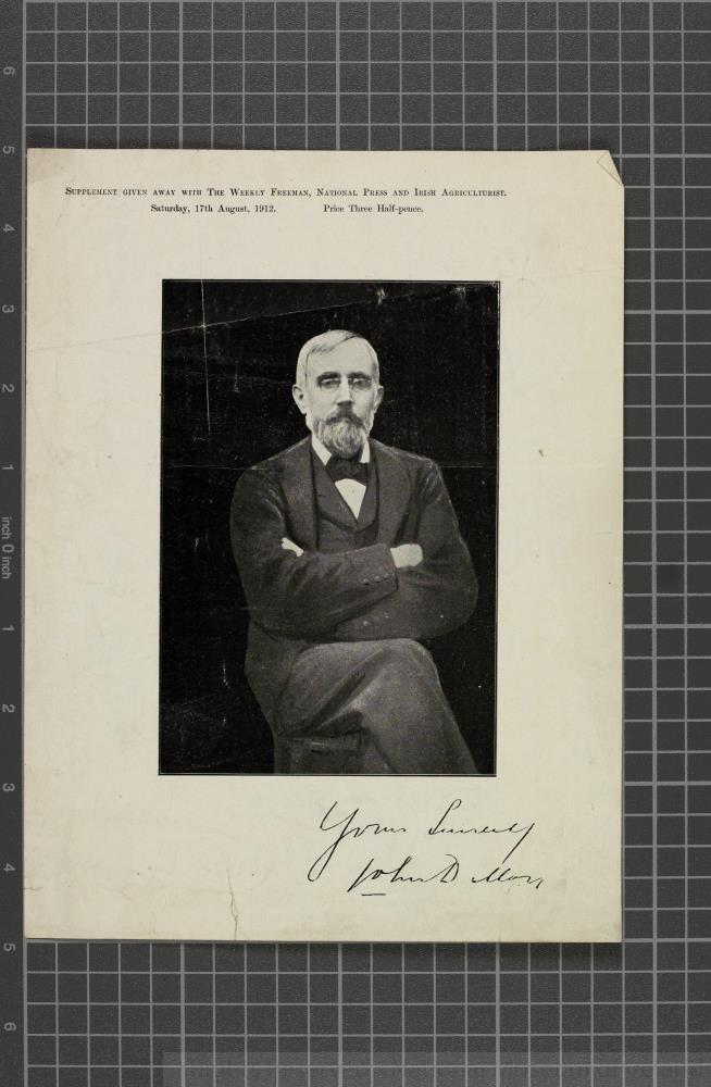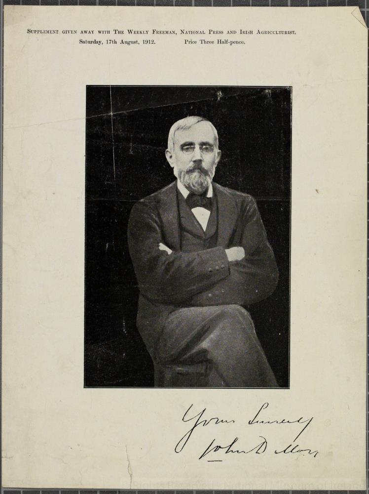 Picture of John Dillon. Ireland 1912. Photograph reproduced in a 'Supplement given away with the Weekly Freeman, National Press and Irish Agriculturalist' Saturday, 17th August, 1912. Signed (in copy) "Yours Sincerely/ John Dillon". Length 25.1 cm x Width 19 cm.;
