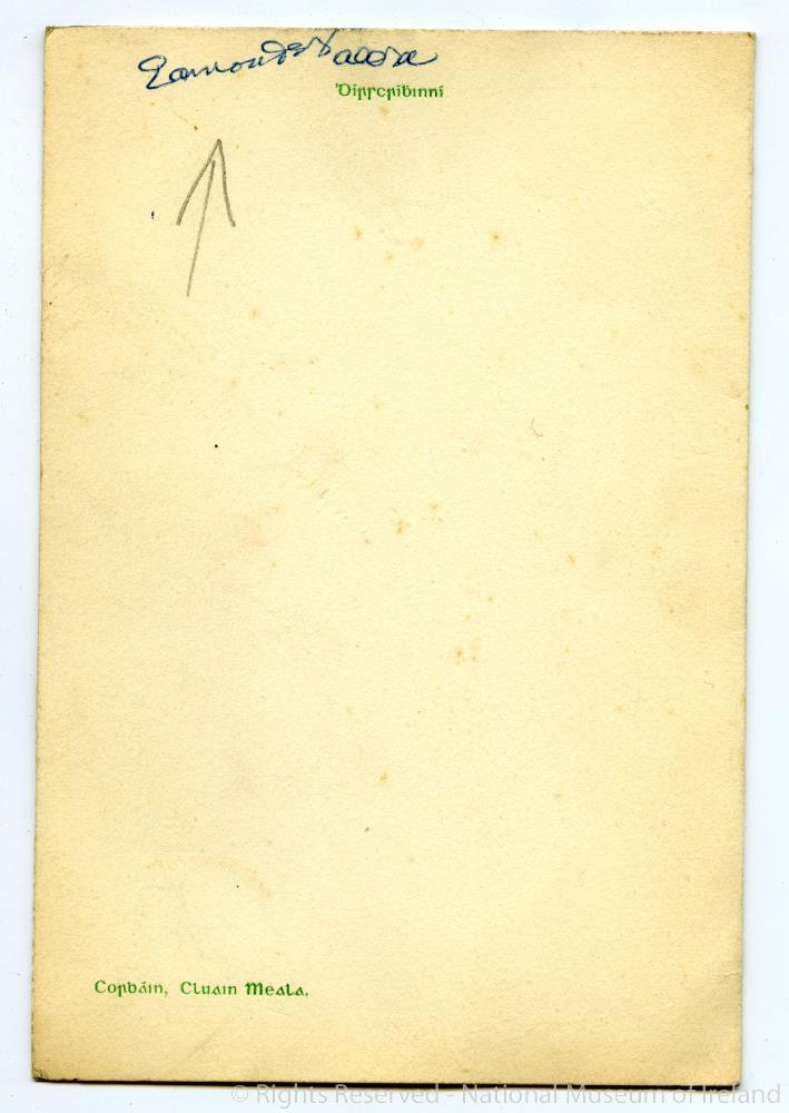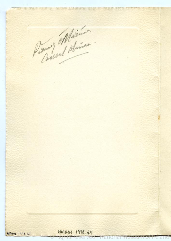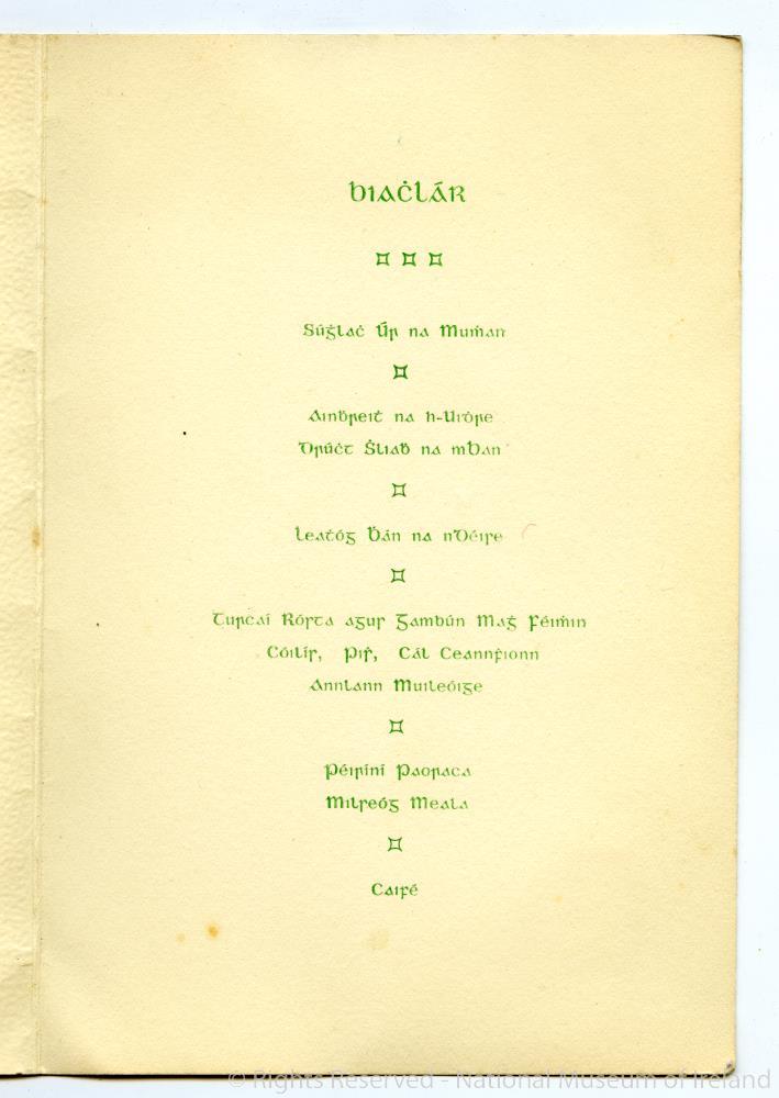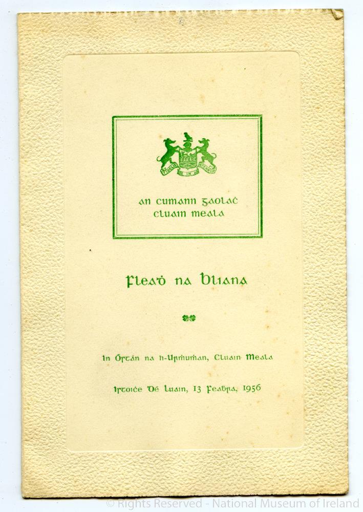 Menu, Clonmel, Co. Tipperary, 1956. Menu from 'Fleadh na Bliana' 1956 (at which Eamon de Velera was chairperson(?)), organised by An Cumann Goalach, Clonmel. Dated Monday 13 February 1956. Signed on back by Eamon de Valera. Signed on inside left by Pádraig Ó Mathúna (donor), Caiseal Mumhan'. Length 19 cm x Width 12.8 cm.;