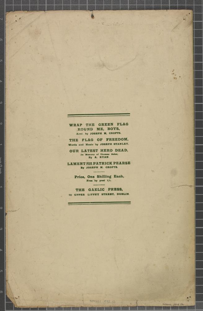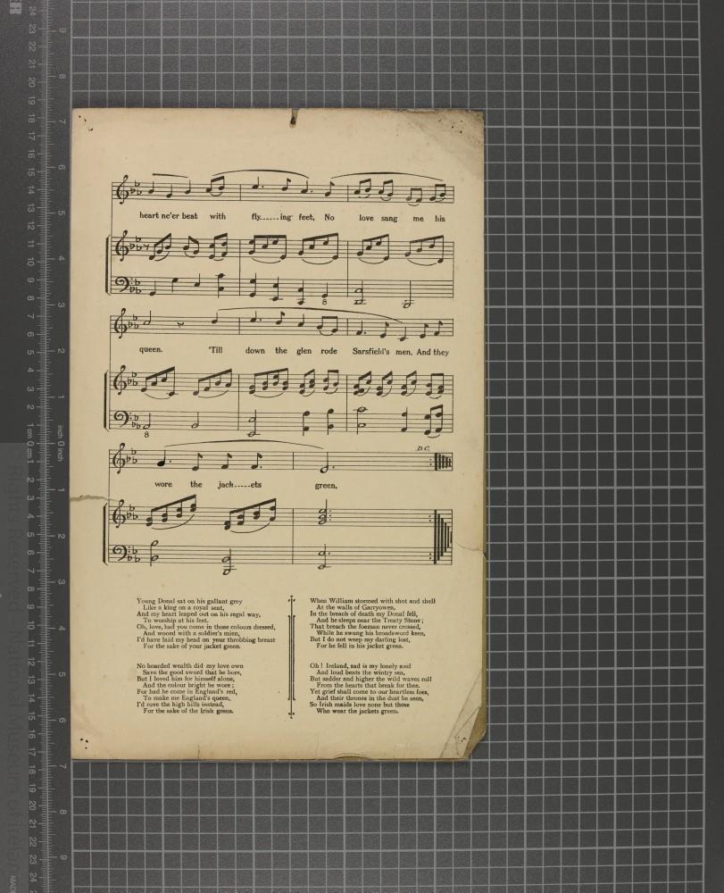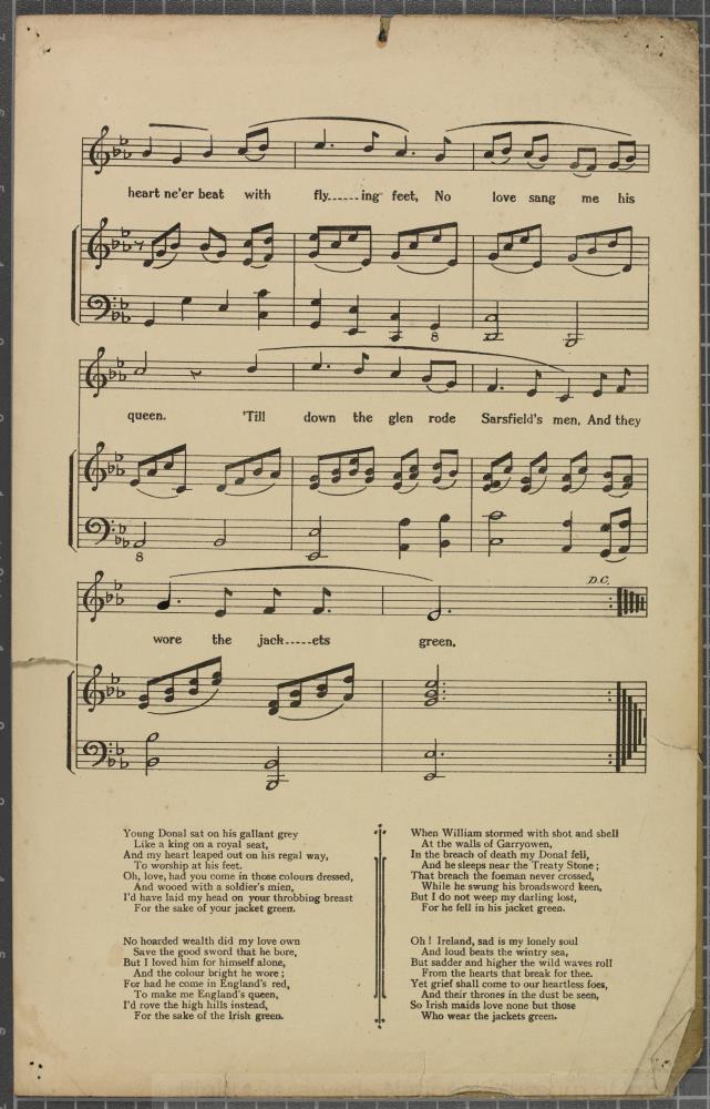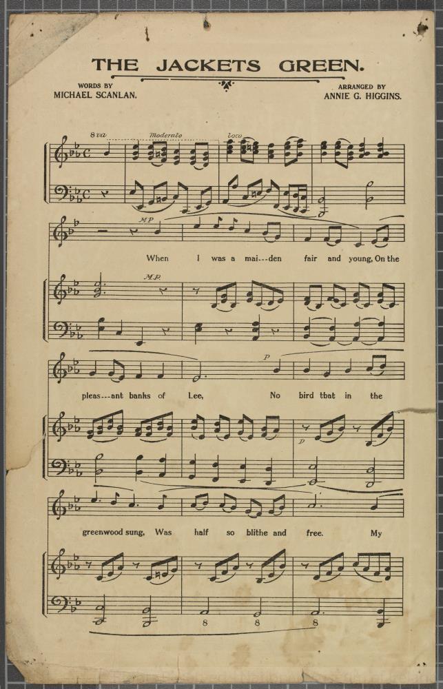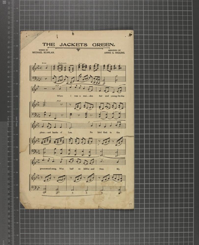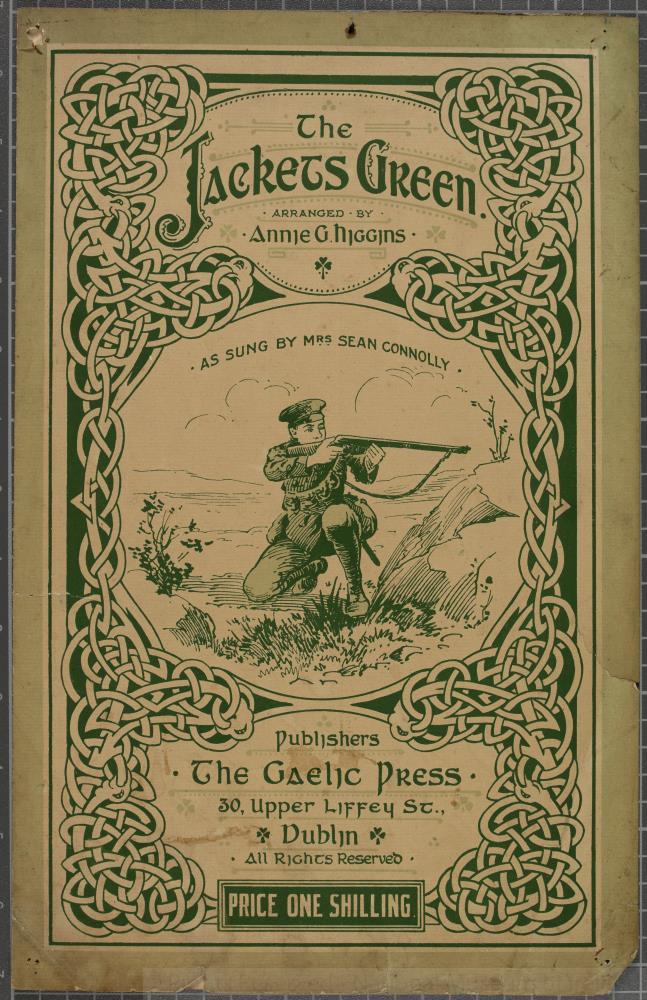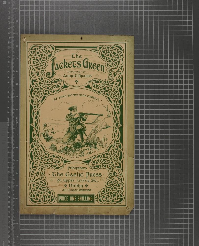 Sheet Music, Dublin, c.1919. 'The Jacket's Green'. Arranged by Annie G. Higgins. 'As sung by Mrs. Sean Connolly'. In five verses. 4pp. Tittle in Celtic lettering, surround by Celtic interlacing. Sketch of a gunman in uniform, also surrounded by interlacing. Text below: 'Publishers: The Gaelic Press: 30, Upper Liffey St., Dublin'. Length 35.9 cm x Width 22.9 cm.;