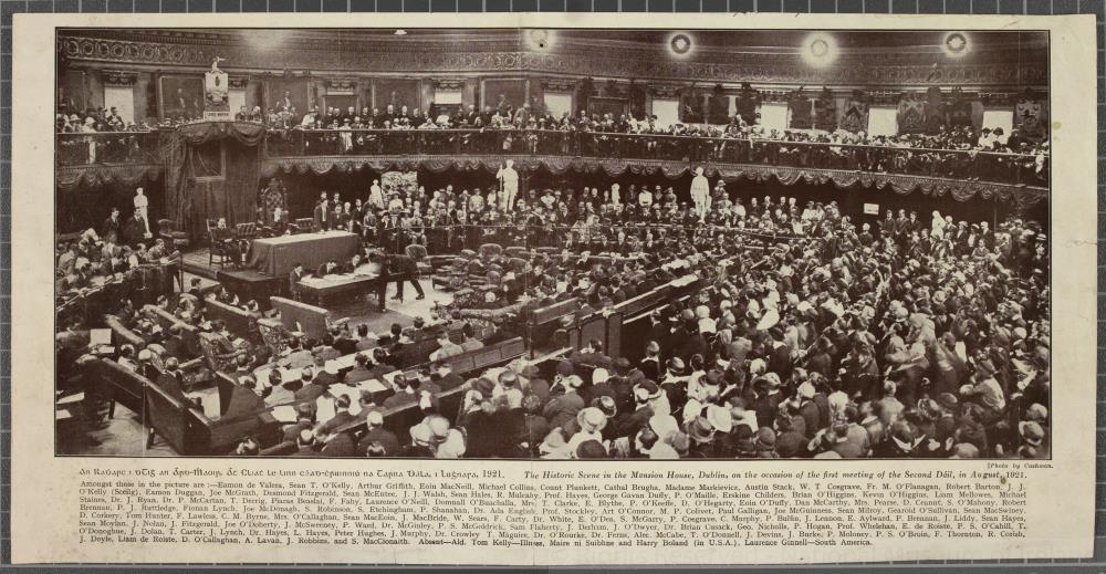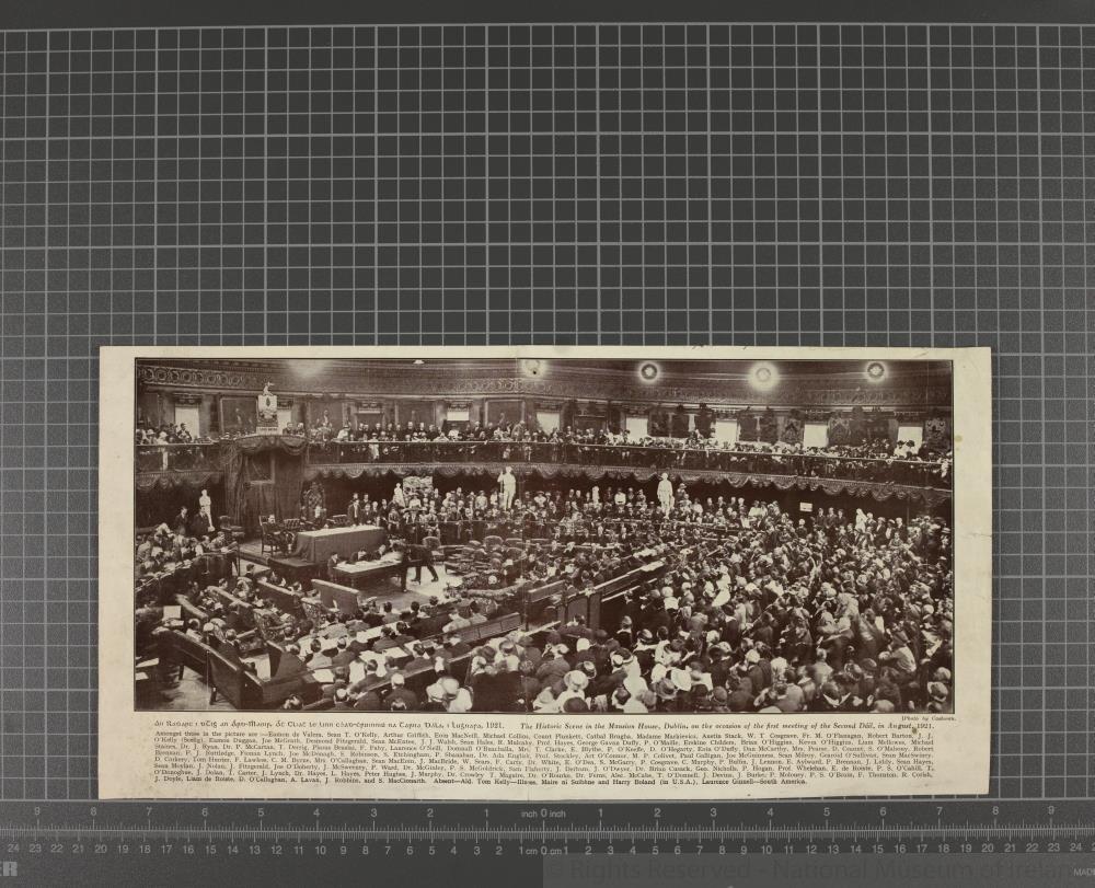 Printed photograph showing the scene of the 1st meeting of the Second Dáil, 16th August 1921, as in HH:1998.7. Caption below gives names of participants. Length 20.3 cm x Width 40.1 cm.;