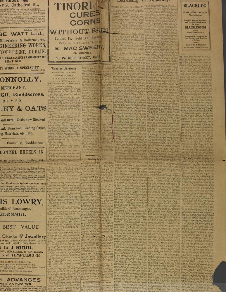 Newspaper page, Tipperary, 1915. From 'The Tipperary Star', 30 October 1915. pp. 7-8. Includes article on a recruitment meeting for the British Army, held in Lisvernane, Glen of Aherlow, Co. Tipperary. Length 59.8 cm x Width 44 cm;
