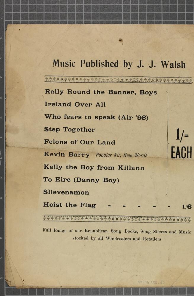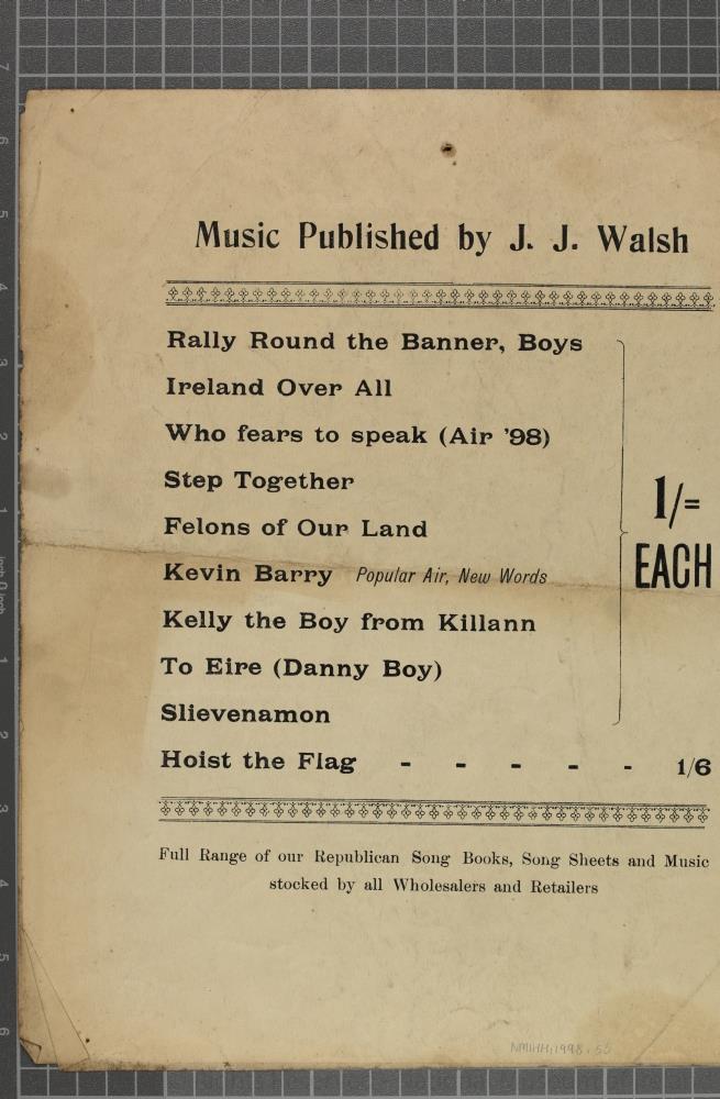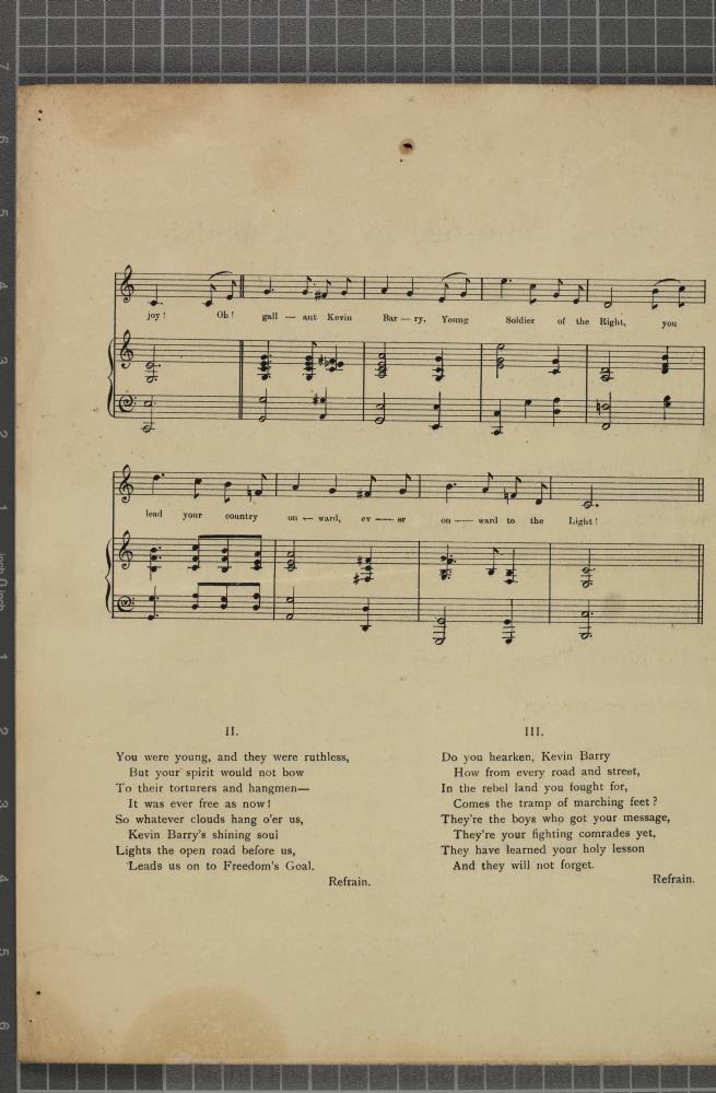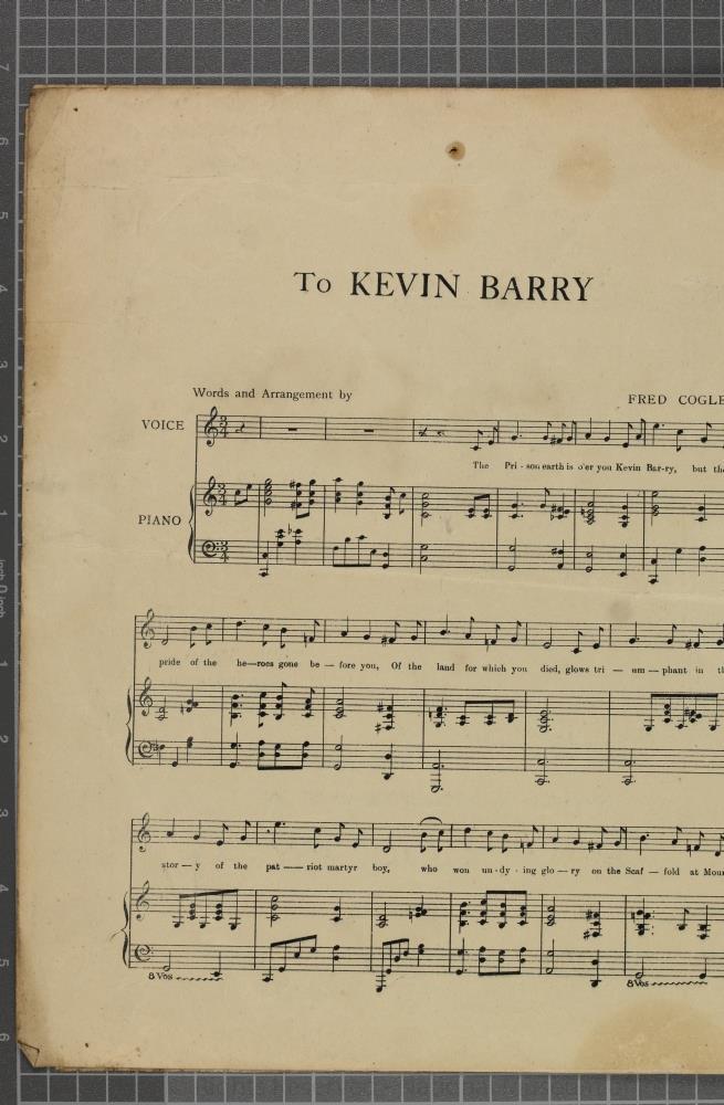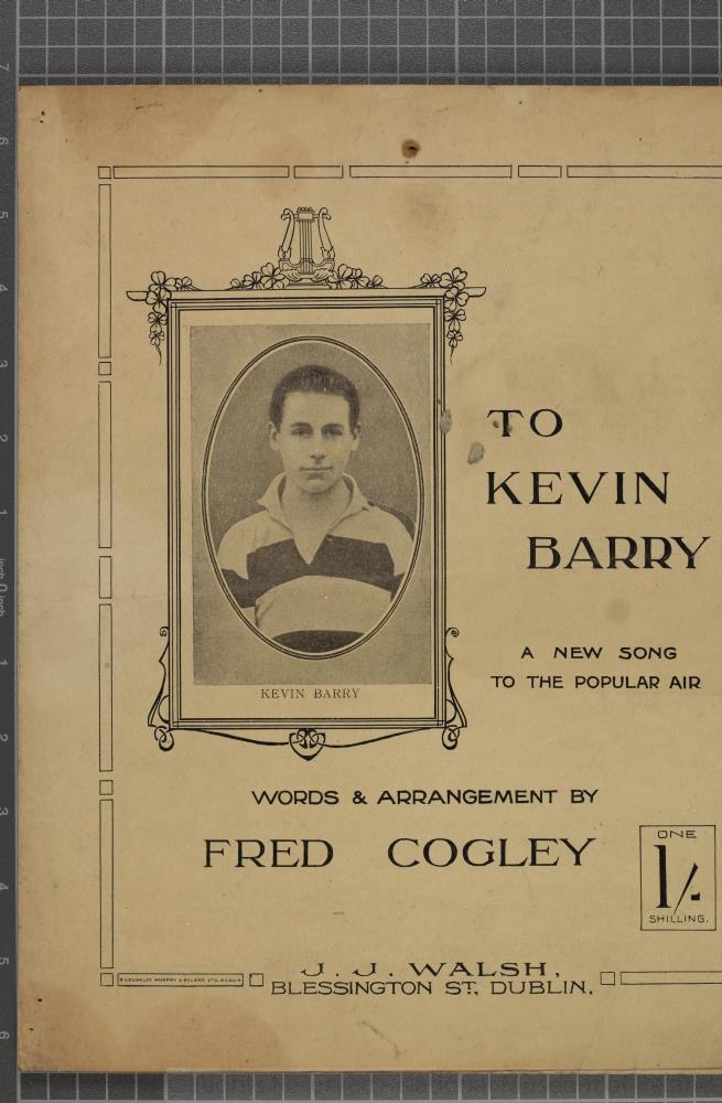 Sheet Music, Dublin, c. 1919 (?). "To Kevin Barry", a new song to the popular air'. Words and arrangment by Fred Cogley. In three verses. 4pp. Published by J.J. Walsh, Blessington Street., Dublin. Printed by O'Loughlin Murphy & Boland Ltd., Dublin. Length 33.5 cm x Width 28 cm.;