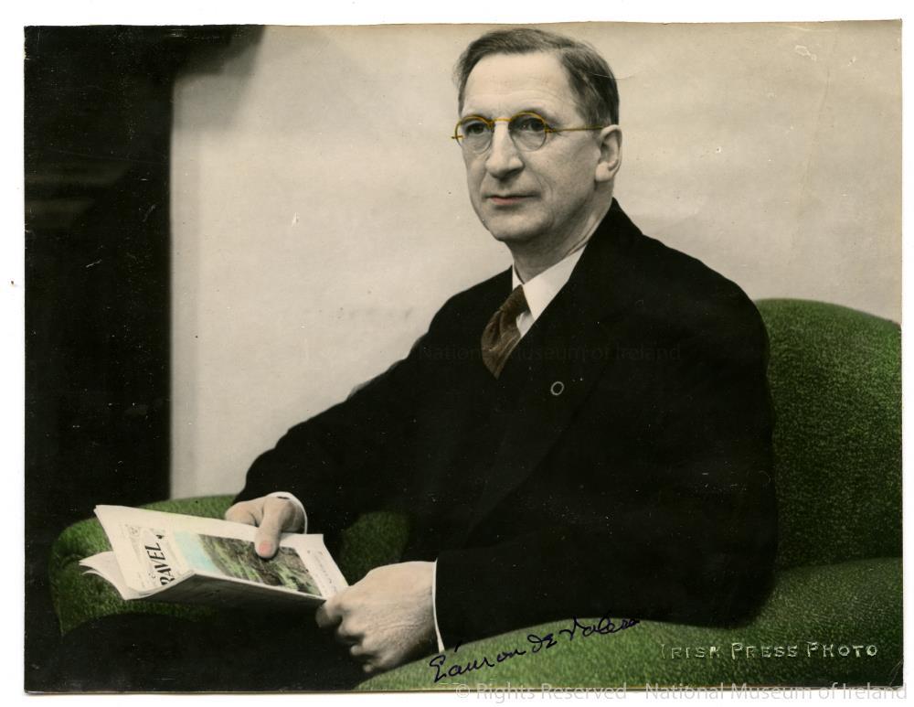 Photograph, Ireland, c.1948. Photograph of Eamon de Valera, seated in an armchair and holding an Irish travel brochure. Originally black and white, handcoloured by donor in 1948. Stamped in lower right corner: 'Irish Press Photo'. Front signed by Eamon de Valera. Reverse signed by donor, with note in Irish recording the hand-colouring. Length 15.2 cm x Width 20 cm.;