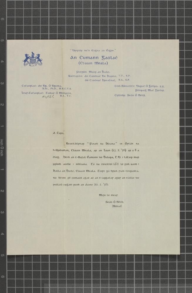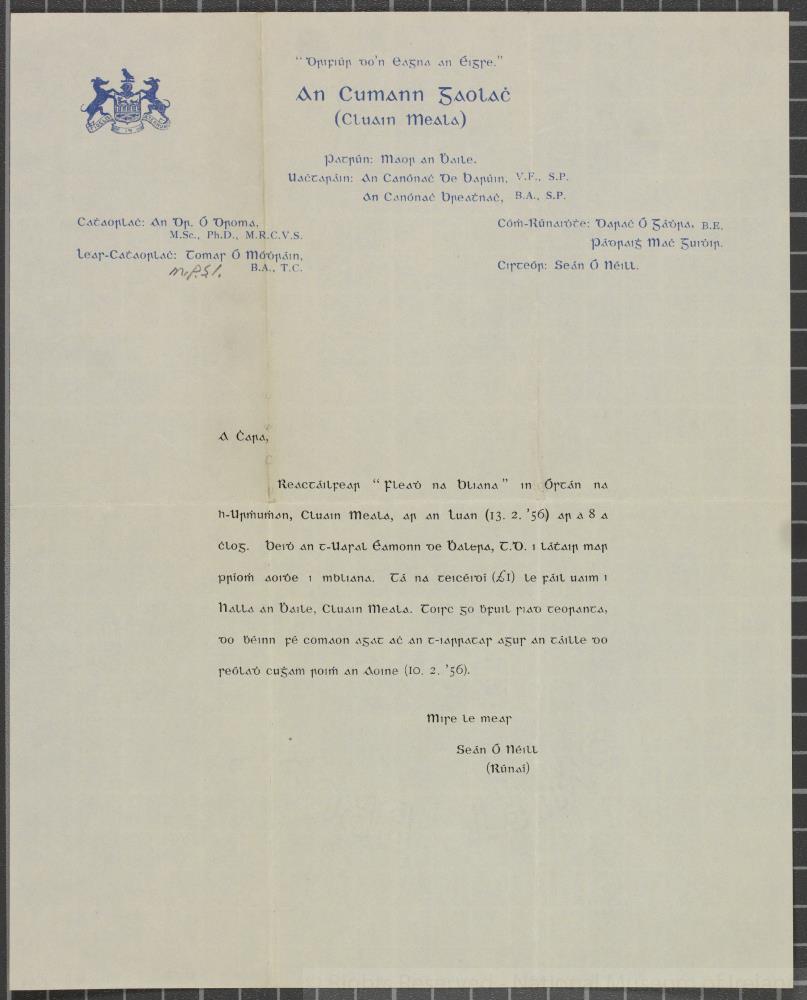 Letter, Clonmel, Co. Tipperary, 1956. Letter from Seán Ó Néill, Secretary of An Cumann Gaolach, Clonmel, to donor, regarding 'Fleadh na Bliana', 1956. Length 25.3 cm x Width 20.3 cm.;