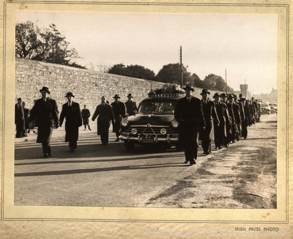 Photograph of the funeral of Mrs Sarah Mellows, mother of Barney and Liam Mellows, 1952. Showing the hearse and a guard of honour of 1916 veterans at Glasnevin. Photograph mounted on card 9.9 by 8 inches.;