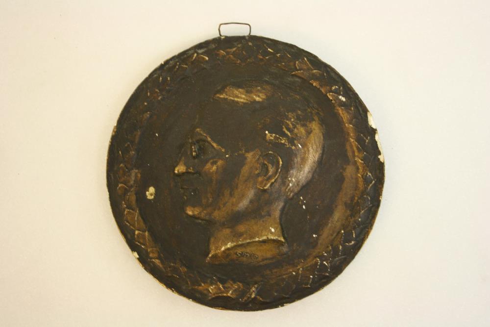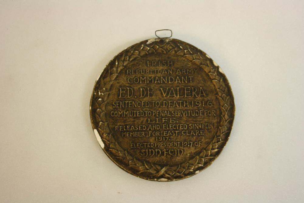 Circular Plaster Plague of Eamon de Valera. 6 inches in diameter, showing bust in profile to left with SME (?) under shoulder within a laurel border. On reverse within a laurel border across, IRISH/REPUBLICAN ARMY/COMMANDANT/ED. DE VALERA/SENTENCED TO DEATH 1916/COMMUTED TO PENCIL SERVITUDE FOR/LIFE./RELEASED AND ELECTED SINN FEIN/MEMBER FOR EAST CLARE/1917./ELECTED PRESIDENT 1917 OF/SINN FEIN. Plaster painted to look like a bronze alloy metal.;