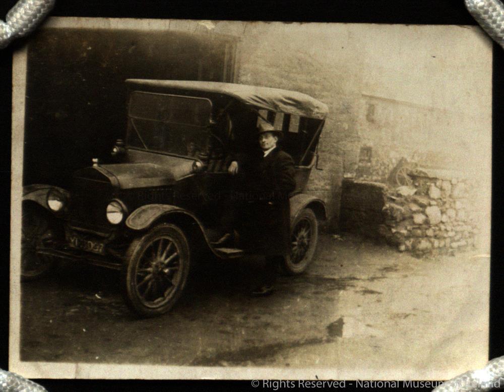 Photograph of Barney Mellows, standing with one foot on the running board of a motor car. Circa 1917.;