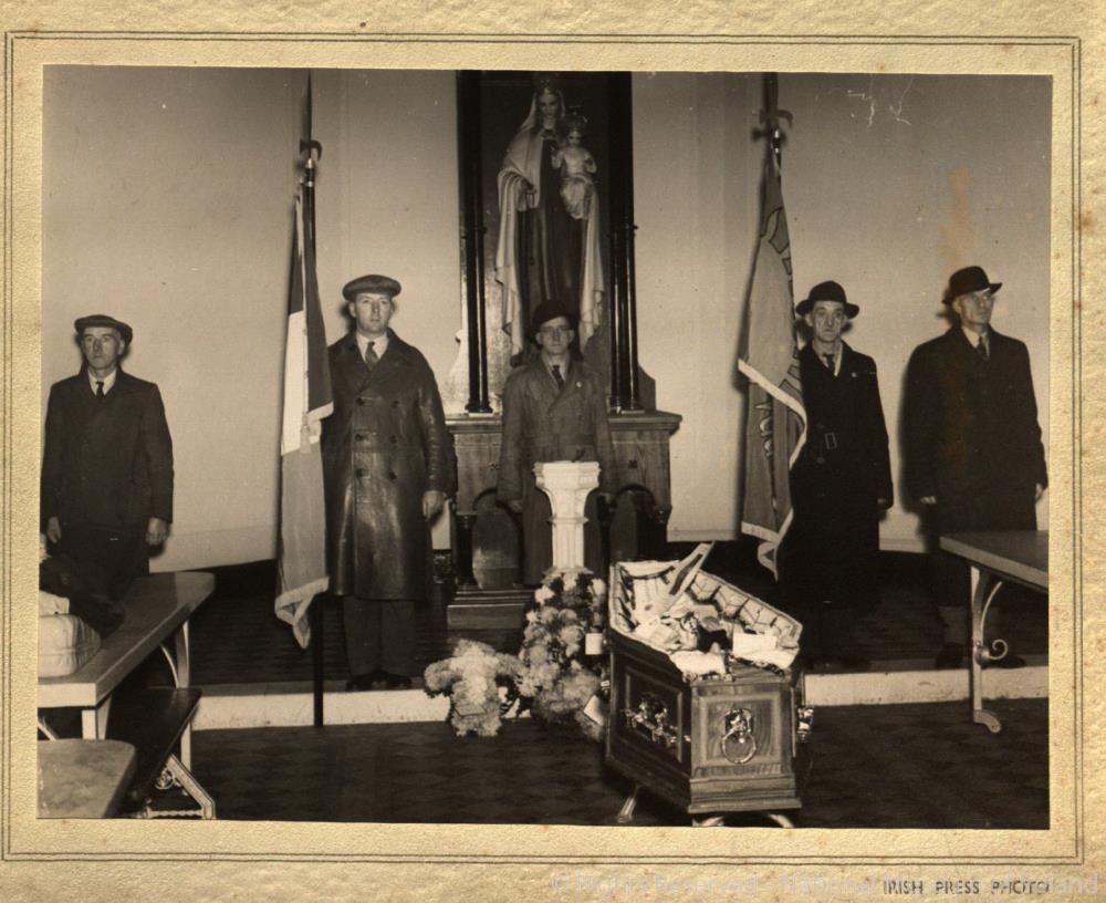 Photograph of the lying in state of Mrs Sarah Mellows, mother of Barney and Liam Mellows. Showing a colour party at the foot of the open coffin, 1952. Photograph mounted on card 8 by 9.9 inches.;