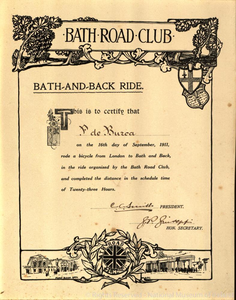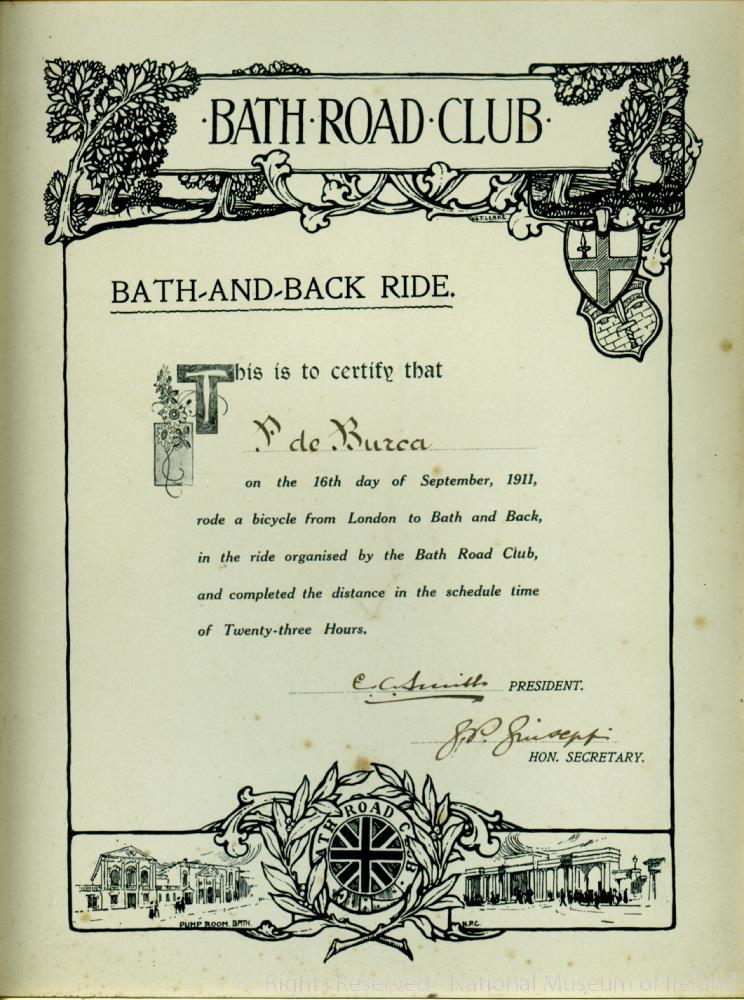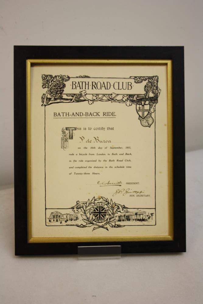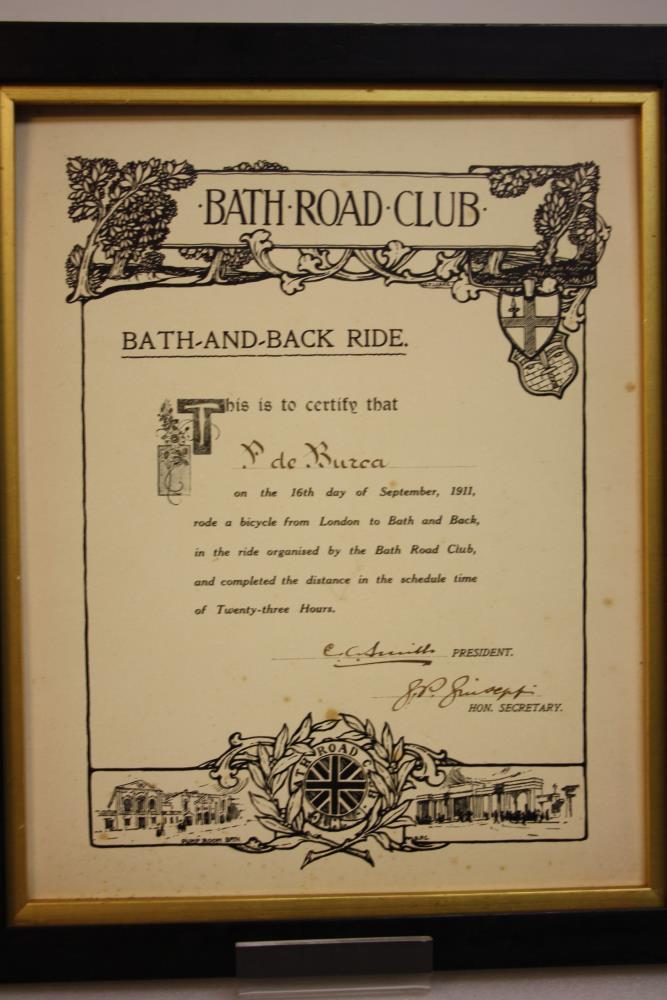 Bath Road Certificate of P. de Burca, certifying his completion of the London-Bath-London cycle trip in less than 23 hours on 16 September 1911. Mounted and glazed in frame, 10.8 by 13 inchess.;
