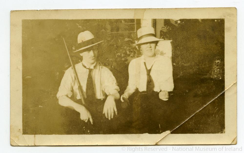 Photograph of Liam Mellows seated with rifle, wearing hat and with lady on his left, taken in USA about 1920. 4.5 x 2.8 ins.;